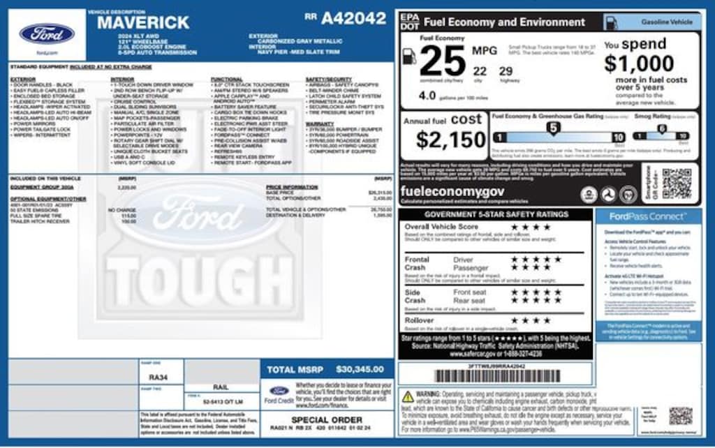 Certified. 2024 Ford Maverick 6 Speakers, Equipment Group 300A Standard, Front reading lights, Illuminated entry, Outside temperature display, Overhead console, Passenger vanity mirror, Power steering, Power windows, Rear seat center armrest, Remote keyless entry, Steering wheel mounted audio controls, Tachometer, Telescoping steering wheel, Tilt steering wheel, Trip computer, Unique Cloth Front Bucket Seats. Clean CARFAX. CARFAX One-Owner. Ford Blue Certified Details:
