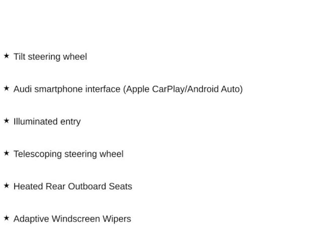 - Smart device integration: Audi smartphone interface (Apple CarPlay/Android Auto)