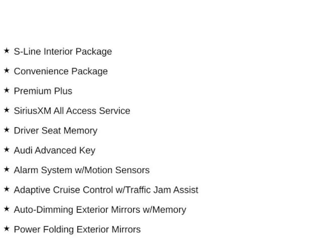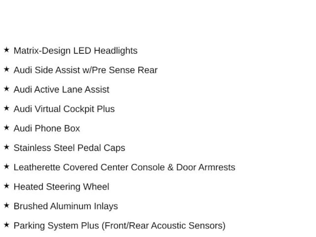 2022 Audi A5 Sportback 7-Speed Automatic S tronic 2 Rear USB Charge Ports, Adaptive Cruise Control w/Traffic Jam Assist, Alarm System w/Motion Sensors, Audi Active Lane Assist, Audi Advanced Key, Audi Phone Box, Audi Side Assist w/Pre Sense Rear, Audi Virtual Cockpit Plus, Auto-Dimming Exterior Mirrors w/Memory, Brushed Aluminum Inlays, Convenience Package, Driver Seat Memory, Heated Steering Wheel, Leather/Dinamica Seating Surfaces, Leatherette Covered Center Console & Door Armrests, Matrix-Design LED Headlights, Parking System Plus (Front/Rear Acoustic Sensors), Power Folding Exterior Mirrors, Premium Plus, S-Line Interior Package, SiriusXM All Access Service, Stainless Steel Pedal Caps, Top View Camera System. 24/31 City/Highway MPG 2.0L 4-Cylinder TFSI