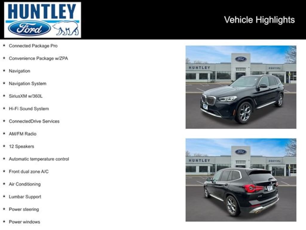 2022 BMW X3 8-Speed Automatic Sport, 12 Speakers, 4-Wheel Disc Brakes, ABS brakes, Air Conditioning, AM/FM Radio, Apple CarPlay & Android Auto Compatibility, Automatic temperature control, BMW Assist eCall, BMW TeleServices, Bumpers: body-color, Connected Package Pro, ConnectedDrive Services, Convenience Package w/ZPA, Dual front impact airbags, Enhanced Bluetooth, Front dual zone A/C, Hi-Fi Sound System, Low tire pressure warning, Lumbar Support, Navigation, Navigation System, Panoramic Moonroof (ZPA), Power driver seat, Power Liftgate, Power steering, Power windows, SiriusXM w/360L, WiFi Hotspot. Clean CARFAX. CARFAX One-Owner.
