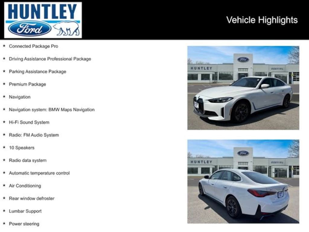 2024 BMW i4 10 Speakers, Active Driving Assistant Pro, Active Park Distance Control, Air Conditioning, Apple CarPlay & Android Auto Compatibility, Automatic temperature control, BMW Assist eCall, BMW Curved Display w/HUD, BMW TeleServices, Connected Package Pro, ConnectedDrive Services, Driving Assistance Professional Package, Extended Traffic Jam Assistant, Heated Front Seats, Heated Steering Wheel, Hi-Fi Sound System, Iconic Sounds Electric, Lumbar Support, Navigation, Navigation system: BMW Maps Navigation, Parking Assistance Package, Parking Assistant Plus, Power driver seat, Power moonroof, Power steering, Power windows, Premium Package, Radio data system, Radio: FM Audio System, Rain sensing wipers, Rear window defroster, Rear-View Camera, Remote keyless entry, Speed-Sensitive Wipers, Steering wheel mounted audio controls, Surround View w/3D View, Variably intermittent wipers, Wheels: 18" x 7.5" Gunmetal Grey Aero, Widescreen Display, Wireless Device Charging. Clean CARFAX. CARFAX One-Owner.