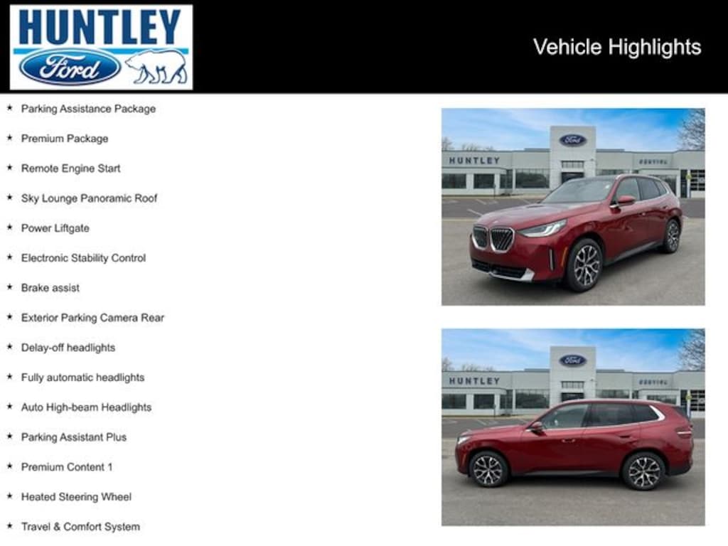 2025 BMW X3 8-Speed Automatic, ACC Stop & Go + Active Driving Assistant, Alloy wheels, Auto High-beam Headlights, BMW Curved Display w/HUD, Brake assist, Delay-off headlights, Electronic Stability Control, Exterior Parking Camera Rear, Fully automatic headlights, Heated Steering Wheel, Interior Camera, Parking Assistance Package, Parking Assistant Plus, Parking Assistant Professional, Power Liftgate, Premium Content 1, Premium Package, Remote Engine Start, Sky Lounge Panoramic Roof, Travel & Comfort System, Veganza Perforated & Quilted Upholstery, Wheels: 19" x 8.5" Aero Midnight Grey Bicolor. Clean CARFAX. CARFAX One-Owner.