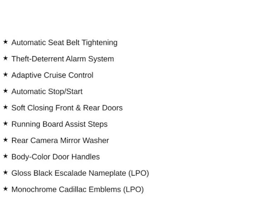 2022 Cadillac Escalade 10-Speed Automatic 4WD, Whisper Beige With Gideon Accents Leather, Adaptive Cruise Control, Air Ride Adaptive Suspension, AKG Studio Reference 36-Speaker Audio System, Automatic Seat Belt Tightening, Automatic Stop/Start, Body-Color Door Handles, Door Lock & Latch Shields, Electronic Limited-Slip Differential, Enhanced Automatic Emergency Braking, Enhanced Automatic Parking Assist, Floor Console w/Covered Storage, Front Auxiliary 12-volt Power Outlet, Glass Breakage Sensor, Gloss Black Escalade Nameplate (LPO), Hitch Guidance w/Hitch View, Illuminating Front & Rear Sill Plates, Integrated Trailer Brake Controller, Monochrome Cadillac Emblems (LPO), Onyx Package (LPO), Platinum Interior Trim, Power Panoramic Tilt-Sliding Sunroof, Preferred Equipment Group 1SH, Rear Camera Mirror, Rear Camera Mirror Washer, Rear Cross Traffic Alert, Rear Seat Entertainment System, Reconfigurable Full-Color Head-Up Display, Reverse Automatic Braking, Running Board Assist Steps, Smart Trailer Integration Indicator, Soft Closing Front & Rear Doors, Start/Stop System Disable Button, Theft-Deterrent Alarm System, Touring Package, Trailer Side Blind Zone Alert, Vehicle Inclination Sensor, Vehicle Interior Movement Sensor, Wheels: 22" 12-Spoke Gloss Black Alloy (LPO), Wheels: 22" Interim (LPO). Clean CARFAX. CARFAX One-Owner. 6.2L V8