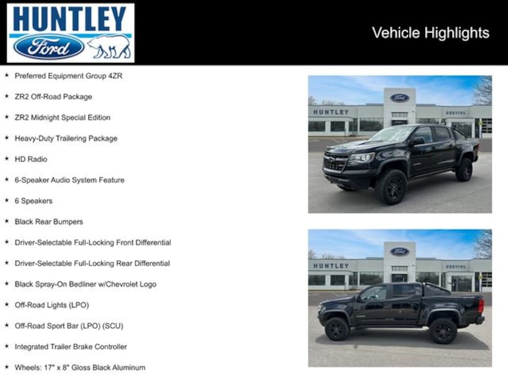 2020 Chevrolet Colorado 4WD, 6 Speakers, 6-Speaker Audio System Feature, Black Rear Bumpers, Black Spray-On Bedliner w/Chevrolet Logo, Driver-Selectable Full-Locking Front Differential, Driver-Selectable Full-Locking Rear Differential, HD Radio, Heavy-Duty Trailering Package, Integrated Trailer Brake Controller, Off-Road Lights (LPO), Off-Road Sport Bar (LPO) (SCU), Preferred Equipment Group 4ZR, Wheels: 17" x 8" Gloss Black Aluminum, ZR2 Midnight Special Edition, ZR2 Off-Road Package. Clean CARFAX.