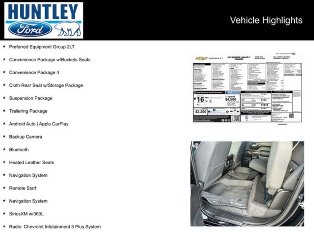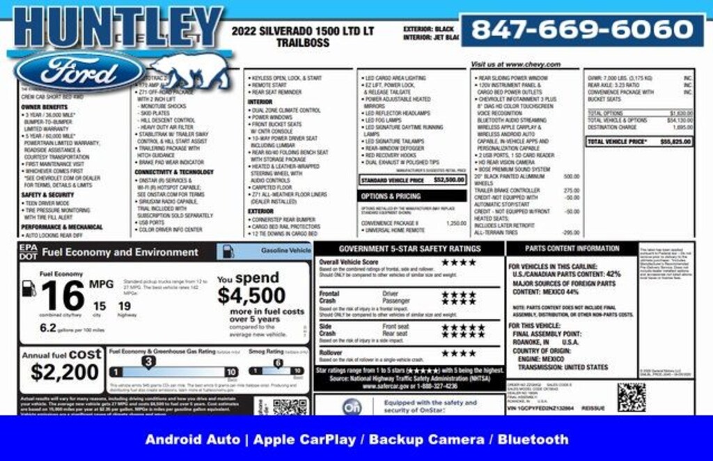 2022 Chevrolet Silverado 1500 LTD Android Auto Apple CarPlay, Backup Camera, Bluetooth, Heated Leather Seats, Navigation System, Remote Start, Silverado 1500 LTD LT Trail Boss, 4D Crew Cab, EcoTec3 5.3L V8, 10-Speed Automatic, 4WD, Black, Black Cloth, 10-Way Power Driver Seat w/Lumbar, 12-Volt Rear Auxiliary Power Outlet, 120-Volt Bed Mounted Power Outlet, 120-Volt Instrument Panel Power Outlet, 2 USB Ports, 2 USB Ports (First Row), 4.2" Diagonal Color Display Driver Info Center, 6 Speakers, All-Weather Floor Liner (LPO) (AAK), AM/FM radio: SiriusXM, Auto-Locking Rear Differential, Auxiliary External Transmission Oil Cooler, Bluetooth® For Phone, Chevrolet Connected Access Capable, Cloth Rear Seat w/Storage Package, Color-Keyed Carpeting Floor Covering, Compass, Convenience Package II, Convenience Package w/Buckets Seats, Deep-Tinted Glass, Dual Exhaust w/Polished Outlets, Dual-Zone Automatic Climate Control, Electric Rear-Window Defogger, Electronic Cruise Control, EZ Lift Power Lock & Release Tailgate, Floor Mounted Center Console, Front LED Fog Lamps, HD Rear Vision Camera, Heated Driver & Front Outboard Passenger Seats, Heated Steering Wheel, Heavy-Duty Air Filter, High Gloss Black Grille, High Gloss Black Mirror Caps, Hill Descent Control, Hitch Guidance, Keyless Open & Start, Leather Wrapped Steering Wheel, LED Cargo Area Lighting, LED Reflector Headlamps, Manual Tilt/Telescoping Steering Column, Navigation System, OnStar & Chevrolet Connected Services Capable, Performance Red Recovery Hooks, Power Door Locks, Power Front Windows w/Driver Express Up/Down, Power Front Windows w/Passenger Express Down, Power Rear Windows w/Express Down, Power Sliding Rear Window w/Rear Defogger, Preferred Equipment Group 2LT, Premium Bose 7-Speaker Sound System, Radio: Chevrolet Infotainment 3 Plus System, Rear Dual USB Charging-Only Ports, Rear Vision Camera, Remote Vehicle Starter System, SiriusXM w/360L, Standard Tailgate, Steering Wheel Audio Controls, Suspension Package, Theft Deterrent System (Unauthorized Entry), Trailering Package, Universal Home Remote, Wheels: 18" x 8.5" Black Painted Aluminum, Wi-Fi Hot Spot Capable, Wireless Phone Projection.