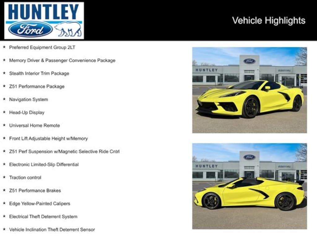 2023 Chevrolet Corvette 2 Cargo Nets, Automatic Leveling System Headlamp Control, Black Exhaust Tips, Driver Power Bolster Seat Adjuster, Edge Yellow-Painted Calipers, Electrical Theft Deterrent System, Electronic Limited-Slip Differential, Front Lift Adjustable Height w/Memory, HD Front & Rear Vision Cameras, Head-Up Display, Heated & Vented Driver & Passenger Seats, Heated Steering Wheel, Heavy-Duty Cooling System, Memory Driver & Passenger Convenience Package, Navigation System, Passenger Power Bolster Seat Adjuster, Performance Data & Video Recorder, Performance Exhaust w/Stainless-Steel Tips, Performance Rear Axle Ratio, Performance Traction Management, Power Driver Lumbar Control Seat Adjuster, Power Passenger Lumbar Control Seat Adjuster, Power-Adjustable Outside Heated Mirrors, Preferred Equipment Group 2LT, Rear Camera Mirror, Rear Cross Traffic Alert, Rear Z51 Spoiler, Side Blind Zone Alert, Stealth Interior Trim Package, Traction control, Universal Home Remote, Vehicle Inclination Theft Deterrent Sensor, Vehicle Interior Movement Theft Deterrent Sensor, Wireless Charging for Devices, Z51 Perf Suspension w/Magnetic Selective Ride Cntrl, Z51 Performance Brakes, Z51 Performance Package, Z51 Performance Suspension. Clean CARFAX.