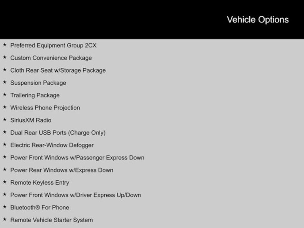 2023 Chevrolet Silverado 1500 8-Speed Automatic, 4WD, Black Cloth, 10-Way Power Driver Seat w/Lumbar, 120-Volt Bed Mounted Power Outlet, 120-Volt Instrument Panel Power Outlet, 3.5" Monochromatic Display Driver Info Center, Auto-Locking Rear Differential, Bluetooth® For Phone, Chevrolet Connected Access Capable, Cloth Rear Seat w/Storage Package, Color-Keyed Carpeting Floor Covering, Compass, Custom Convenience Package, Deep-Tinted Glass, Dual Rear USB Ports (Charge Only), Electric Rear-Window Defogger, Electrical Steering Column Lock, Electronic Cruise Control, EZ Lift Power Lock & Release Tailgate, Front Rubberized Vinyl Floor Mats, HD Rear Vision Camera, Heavy-Duty Air Filter, Hill Descent Control, Hitch Guidance, LED Cargo Area Lighting, Manual Tilt Wheel Steering Column, OnStar & Chevrolet Connected Services Capable, Performance Red Recovery Hooks, Power Front Windows w/Driver Express Up/Down, Power Front Windows w/Passenger Express Down, Power Rear Windows w/Express Down, Preferred Equipment Group 2CX, Rear 60/40 Folding Bench Seat (Folds Up), Rear Rubberized-Vinyl Floor Mats, Remote Keyless Entry, Remote Vehicle Starter System, SiriusXM Radio, Standard Tailgate, Suspension Package, Theft Deterrent System (Unauthorized Entry), Trailering Package, Wi-Fi Hot Spot Capable, Wireless Phone Projection. Clean CARFAX. CARFAX One-Owner.