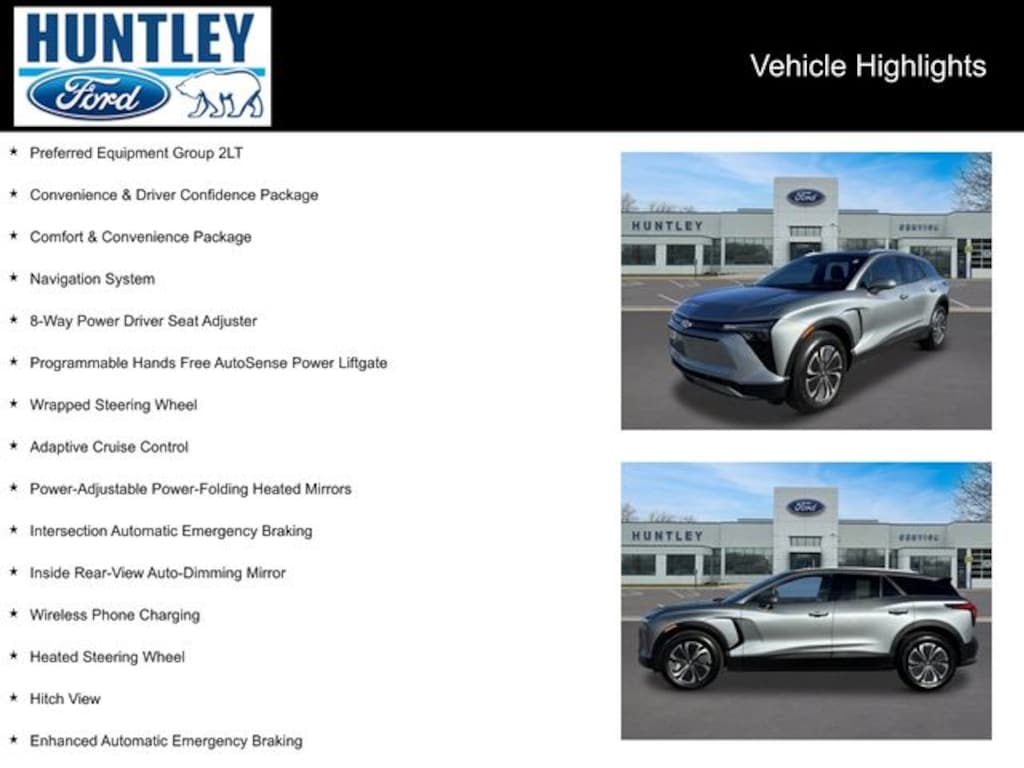 2024 Chevrolet Blazer EV 2-Way Power Driver Lumbar Seat Adjuster, 2-Way Power Passenger Lumbar Seat Adjuster, 6-Way Power Passenger Seat Adjuster, 8-Way Power Driver Seat Adjuster, Adaptive Cruise Control, Comfort & Convenience Package, Convenience & Driver Confidence Package, Enhanced Automatic Emergency Braking, HD Surround Vision, Heated Driver & Fr Passenger Seats Cushion & Seatback, Heated Steering Wheel, Hitch Guidance, Hitch View, Inside Rear-View Auto-Dimming Mirror, Intersection Automatic Emergency Braking, Navigation System, Power-Adjustable Power-Folding Heated Mirrors, Preferred Equipment Group 2LT, Programmable Hands Free AutoSense Power Liftgate, Rear Pedestrian Alert, Reverse Automatic Braking, Satin Aluminum Finish Roof Rails, Side Bicyclist Alert, Wireless Phone Charging, Wrapped Steering Wheel. Clean CARFAX. CARFAX One-Owner.