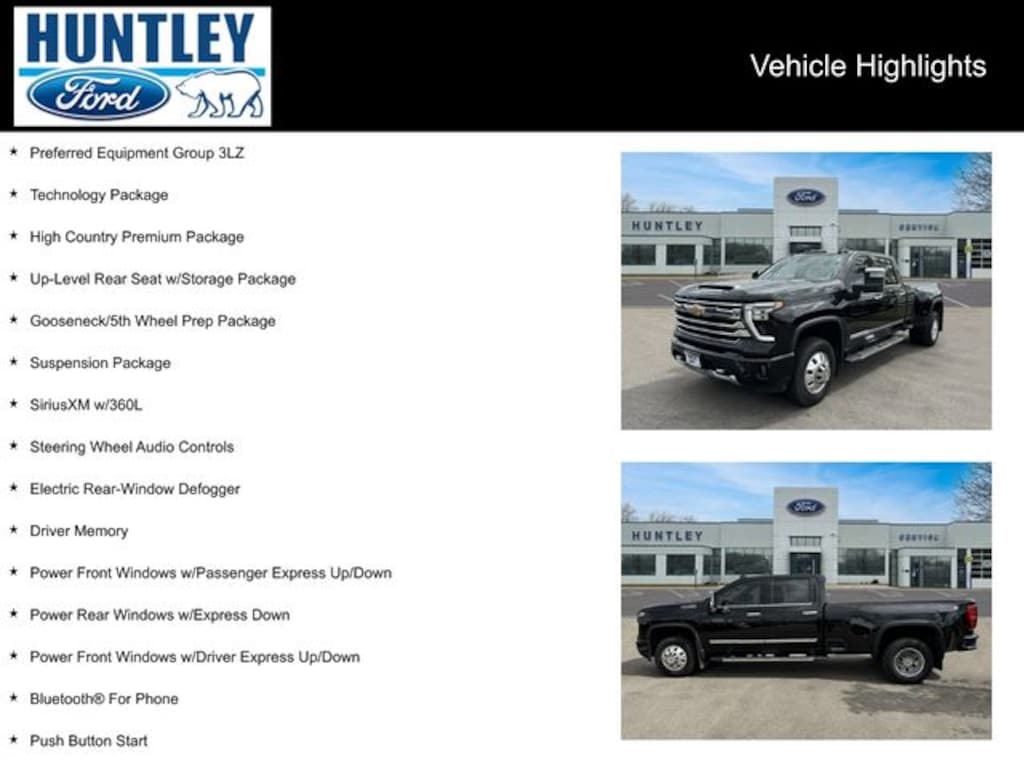 2024 Chevrolet Silverado 3500HD 10-Speed Automatic, 4WD, Black Leather, 120-Volt Bed Mounted Power Outlet, 120-Volt Interior Power Outlet, 18" Polished Forged Aluminum Wheels, 220 Amp Alternator, 6" Rectangular Chromed Tubular Assist Steps, Adaptive Cruise Control, Auto-Dimming Inside Rear-View Mirror, Auto-Dimming Inside Rearview Mirror w/Camera, Bed View Camera w/2 Trailer Camera Provisions, Bluetooth® For Phone, Chevrolet Connected Access Capable, Chevytec Spray-On Black Bedliner, Chrome Door Handles, Chrome Mirror Caps, Color-Keyed Carpeting Floor Covering, Compass Located In Instrument Cluster, Deep-Tinted Glass, Driver Memory, Electric Rear-Window Defogger, Engine Block Heater, Exhaust Brake, Front Carpeted Floor Mats, Front Chrome Recovery Hooks, Front LED Fog Lamps, Front Rain-Sensing Wipers, Gooseneck/5th Wheel Prep Package, Heated 2nd Row Outboard Seats, Heated Steering Wheel, Heavy-Duty 80 Amp-Hr Battery, High Country Premium Package, High Idle Switch, Hitch Guidance w/Hitch View, In-Vehicle Trailering App System, Keyless Open & Start, LED Cargo Area Lighting, Manual Tilt-Wheel/Telescoping Steering Column, Memory seat, Multicolor 15" Diagonal Head-Up Display, OnStar & Chevrolet Connected Services Capable, Polished Exhaust Tip, Power Door Locks, Power driver seat, Power Front Windows w/Driver Express Up/Down, Power Front Windows w/Passenger Express Up/Down, Power Rear Windows w/Express Down, Power Sliding Rear Window w/Defogger, Power steering, Power Sunroof, Power Tailgate, Power windows, Preferred Equipment Group 3LZ, Push Button Start, Rain sensing wipers, Rear Carpeted Floor Mats, Rear Cross Traffic Alert, Remote keyless entry, Remote Vehicle Starter System, SiriusXM w/360L, Standard Tailgate, Steering Wheel Audio Controls, Steering wheel mounted audio controls, Steering Wheel Mounted Electronic Cruise Control, Suspension Package, Technology Package, Trailer Camera Provisions, Trailer Side Blind Zone Alert, Ultrasonic Front & Rear Park Assist, Unauthorized Entry Theft-Deterrent System, Universal Home Remote, Up-Level Rear Seat w/Storage Package, Variably intermittent wipers, Wi-Fi Hotspot Capable, Wireless Charging, Wrapped Steering Wheel. Clean CARFAX.