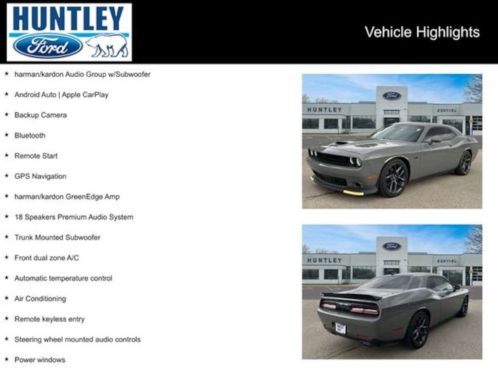 2023 Dodge Challenger Android Auto Apple CarPlay, Backup Camera, Bluetooth, Remote Start, 18 Speakers Premium Audio System, 4-Wheel Disc Brakes, ABS brakes, Air Conditioning, Apple CarPlay/Android Auto, Automatic temperature control, Bumpers: body-color, Dual front impact airbags, Front dual zone A/C, GPS Navigation, harman/kardon Audio Group w/Subwoofer, harman/kardon GreenEdge Amp, Power driver seat, Power steering, Power windows, Remote keyless entry, Spoiler, Steering wheel mounted audio controls, Surround Sound, Trunk Mounted Subwoofer. CARFAX One-Owner.