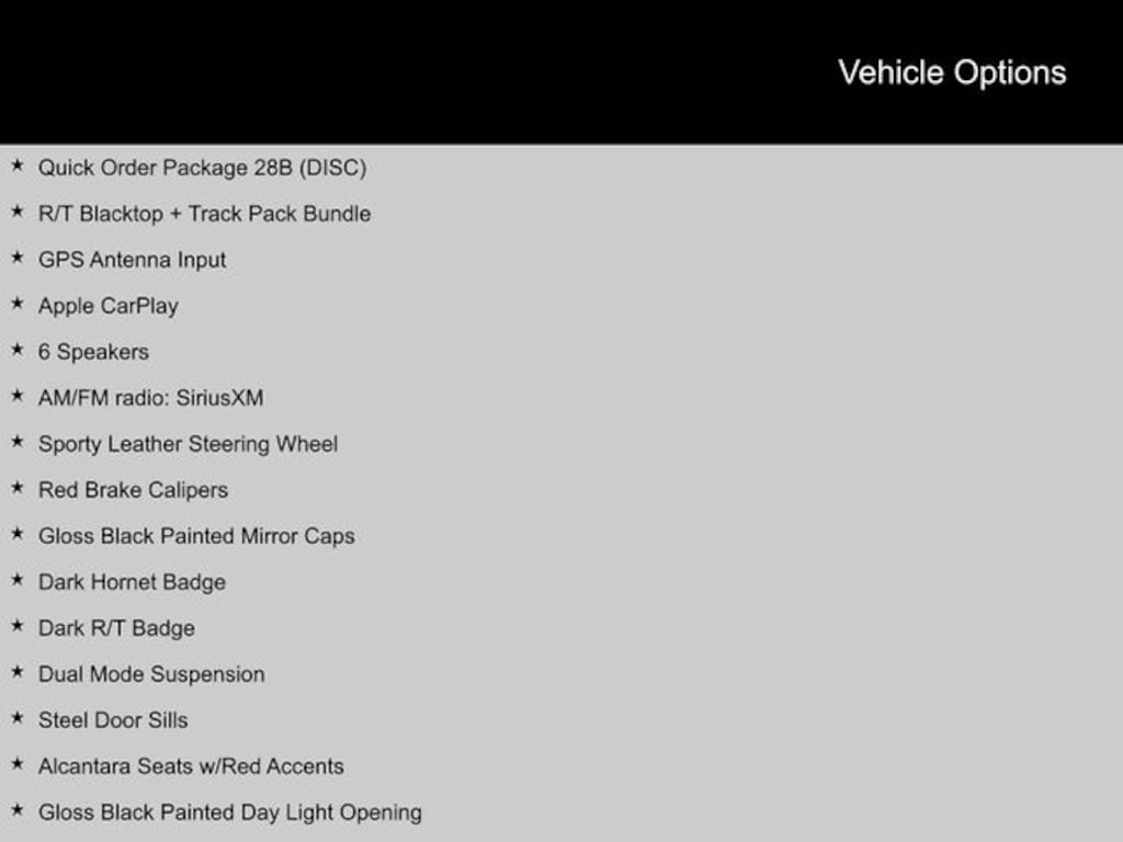 2024 Dodge Hornet 1.3L I4, 6 Speakers, Alcantara Seats w/Red Accents, AM/FM radio: SiriusXM, Apple CarPlay, Bright Pedals, Dark Hornet Badge, Dark R/T Badge, Dual Mode Suspension, Gloss Black Painted Day Light Opening, Gloss Black Painted Mirror Caps, GPS Antenna Input, Power 4-Way Driver Lumbar Adjust, Power 4-Way Passenger Lumbar Adjust, Power Adjust 8-Way Driver Seat, Power Adjust 8-Way Front Passenger Seat, Quick Order Package 28B (DISC), R/T Blacktop + Track Pack Bundle, Red Brake Calipers, Sporty Leather Steering Wheel, Steel Door Sills, Wheels: 20" x 8" Abyss Finish Aluminum. CARFAX One-Owner.