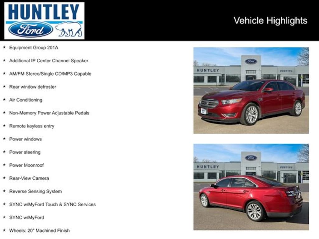 2014 Ford Taurus Additional IP Center Channel Speaker, Air Conditioning, AM/FM Stereo/Single CD/MP3 Capable, Equipment Group 201A, Non-Memory Power Adjustable Pedals, Power Moonroof, Power steering, Power windows, Rear window defroster, Rear-View Camera, Remote keyless entry, Reverse Sensing System, SYNC w/MyFord, SYNC w/MyFord Touch & SYNC Services, Wheels: 20" Machined Finish.