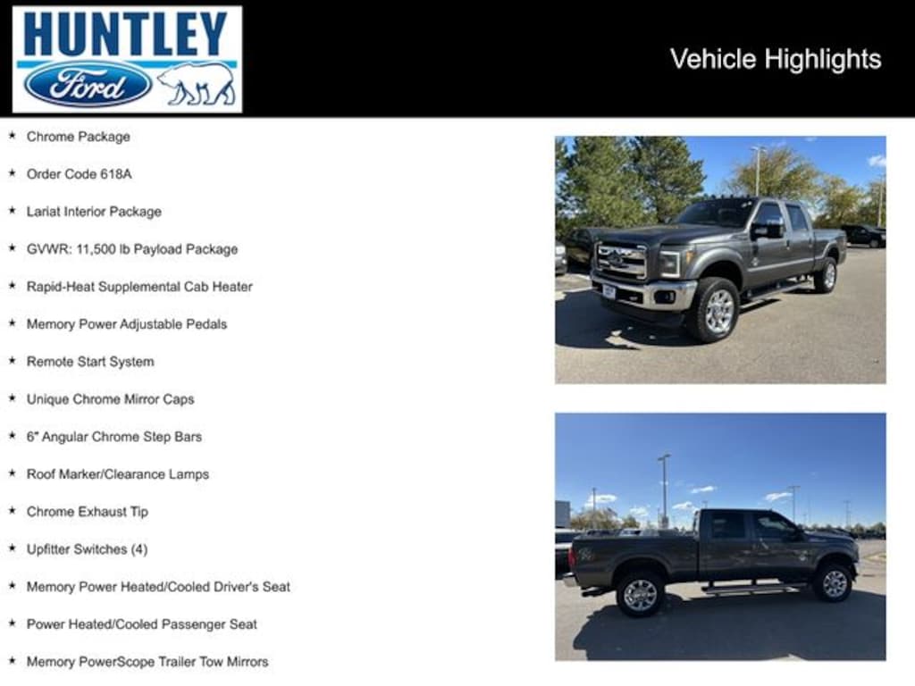 2015 Ford F-350SD 4WD, 20" Chrome Clad Cast Aluminum Wheels, 6" Angular Chrome Step Bars, Chrome Exhaust Tip, Chrome Package, Electronic Locking w/3.55 Axle Ratio, GVWR: 11,500 lb Payload Package, Lariat Interior Package, Memory Power Adjustable Pedals, Memory Power Heated/Cooled Driver's Seat, Memory PowerScope Trailer Tow Mirrors, Order Code 618A, Power Heated/Cooled Passenger Seat, Rapid-Heat Supplemental Cab Heater, Remote Start System, Roof Marker/Clearance Lamps, Unique Chrome Mirror Caps, Upfitter Switches (4).