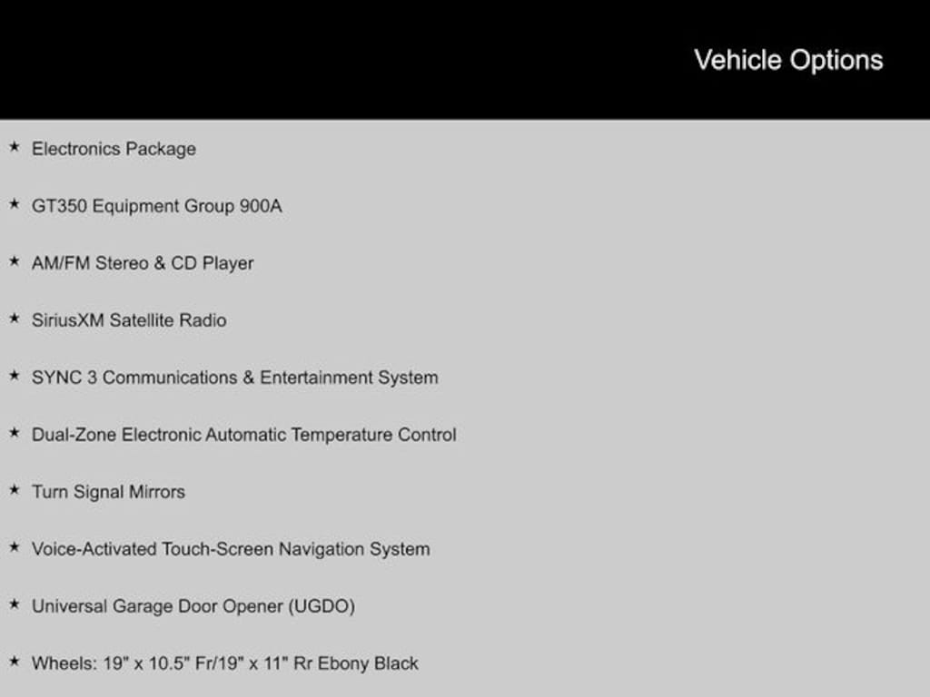 2018 Ford Mustang AM/FM Stereo & CD Player, Dual-Zone Electronic Automatic Temperature Control, Electronics Package, GT350 Equipment Group 900A, SiriusXM Satellite Radio, SYNC 3 Communications & Entertainment System, Turn Signal Mirrors, Universal Garage Door Opener (UGDO), Voice-Activated Touch-Screen Navigation System, Wheels: 19" x 10.5" Fr/19" x 11" Rr Ebony Black.