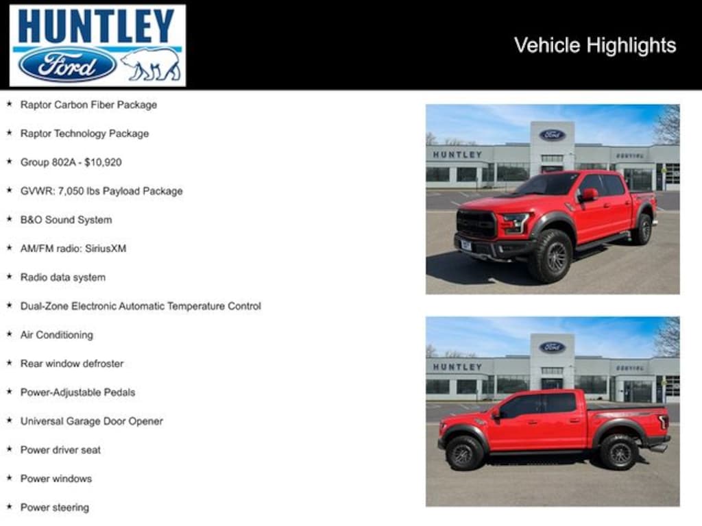 2019 Ford F-150 4WD, 10-Way Power Driver & Passenger Seats, 360 Degree Camera, 4.10 Front Axle w/Torsen Differential, 8" Productivity Screen, Adaptive Cruise Control w/Stop-and-Go, Advanced Security Pack, Air Conditioning, AM/FM radio: SiriusXM, Ambient Lighting - Ice Blue Color Only, B&O Sound System, BLIS Blind Spot Information System, Dual-Zone Electronic Automatic Temperature Control, Electronic Locking w/4.10 Axle Ratio, Group 802A - $10,920, GVWR: 7,050 lbs Payload Package, Heated & Ventilated Leather 40/Console/40 Front Seats, Heated Steering Wheel, Inflatable Rear Safety Belts, Integrated Trailer Brake Controller, Intelligent Access w/Push-Button Start, Lane Keeping System w/Alert & Assist, LED Box Lighting, LED Sideview Mirror Spotlights, Memory System (Seat, Pedal, Exterior Mirror), Power driver seat, Power Glass Heated Sideview Mirrors, Power steering, Power Tilt/Telescoping Steering Column w/Memory, Power windows, Power-Adjustable Pedals, Power-Sliding Rear Window, Pro Trailer Backup Assist, Radio data system, Rain-Sensing Windshield Wipers, Raptor Carbon Fiber Package, Raptor Technology Package, Rear window defroster, Remote keyless entry, Remote Start System w/Remote Tailgate Release, Steering wheel mounted audio controls, SYNC 3, Tailgate Applique FORD, Tough Bed Spray-In Bedliner, Twin Panel Moonroof, Unique High Gloss Black Carbon Fiber Shift Knob, Universal Garage Door Opener, Voice-Activated Touchscreen Navigation.