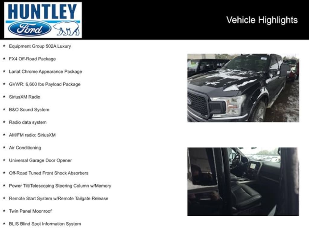 2019 Ford F-150 4WD, 110V/400W Outlet, 2nd Row Heated Seats, 4x4 FX4 Off-Road Bodyside Decal, Air Conditioning, AM/FM radio: SiriusXM, B&O Sound System, BLIS Blind Spot Information System, Chrome 2-Bar Grille w/4 Minor Bars, Chrome Angular Step Bars, Chrome Door & Tailgate Handles w/Body-Color Bezel, Chrome Skull Caps on Exterior Mirrors, Equipment Group 502A Luxury, FX4 Off-Road Package, GVWR: 6,600 lbs Payload Package, Heated Steering Wheel, Hill Descent Control, Lariat Chrome Appearance Package, Leather-Trimmed Bucket Seats, LED Sideview Mirror Spotlights, Off-Road Tuned Front Shock Absorbers, Power Glass Sideview Mirr w/Chrome Skull Caps, Power Tilt/Telescoping Steering Column w/Memory, Quad Beam LED Headlamps & LED Taillamps/Fog Lamps, Radio data system, Rain-Sensing Wipers, Remote Start System w/Remote Tailgate Release, Reverse Sensing System, Single-Tip Chrome Exhaust, SiriusXM Radio, Tray Style Floor Liner, Twin Panel Moonroof, Universal Garage Door Opener, Wheels: 18" Chrome-Like PVD, Windshield Wiper De-Icer. Clean CARFAX.