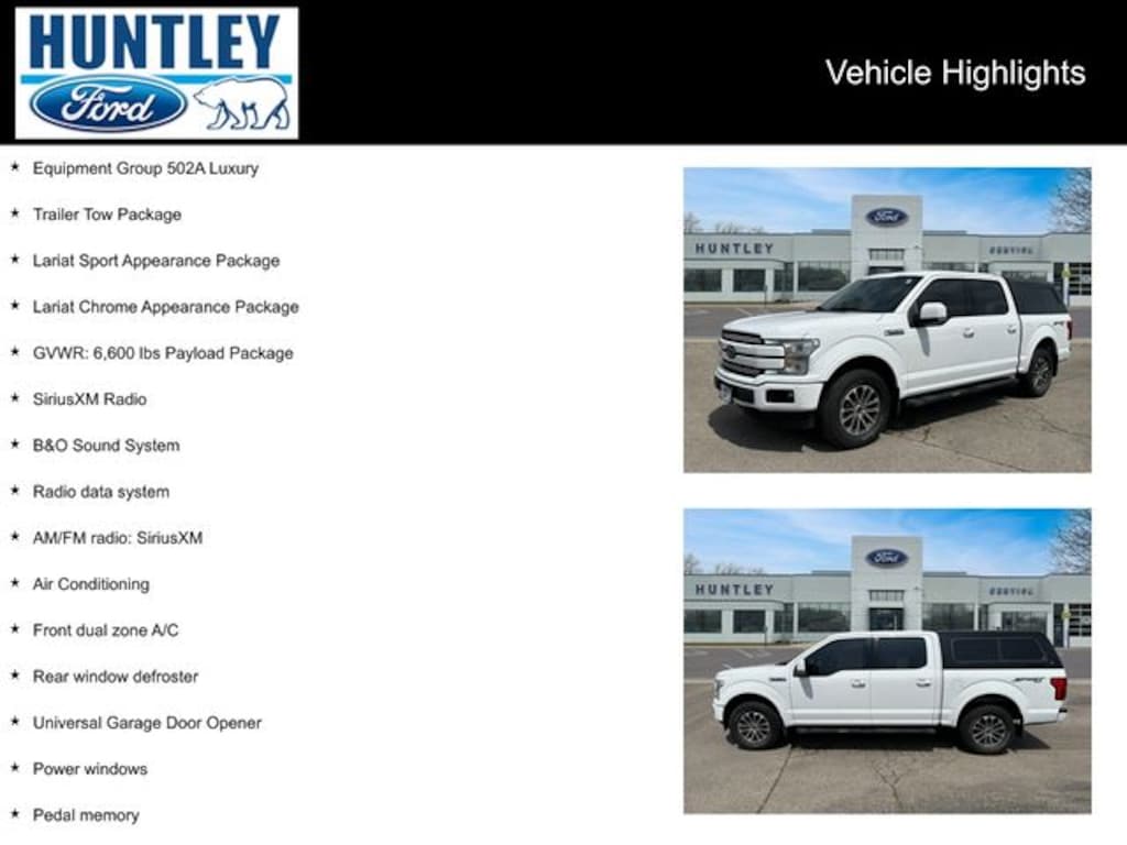 2019 Ford F-150 4WD, 110V/400W Outlet, 2-Bar Body-Color Grille w/4 Minor Bars, 2nd Row Heated Seats, 3.55 Axle Ratio, ABS brakes, Accent-Color Angular Step Bars, Air Conditioning, Alloy wheels, AM/FM radio: SiriusXM, B&O Sound System, BLIS Blind Spot Information System, Body-Color Front & Rear Bumpers, Box Side Decals, Chrome 2-Bar Grille w/4 Minor Bars, Chrome Angular Step Bars, Chrome Door & Tailgate Handles w/Body-Color Bezel, Chrome Skull Caps on Exterior Mirrors, Class IV Trailer Hitch Receiver, Compass, Electronic Stability Control, Engine Oil Cooler, Equipment Group 502A Luxury, Extended Range 36 Gallon Fuel Tank, Front dual zone A/C, GVWR: 6,600 lbs Payload Package, Heated door mirrors, Heated front seats, Heated Steering Wheel, Illuminated entry, Lariat Chrome Appearance Package, Lariat Sport Appearance Package, Leather-Trimmed Bucket Seats, LED Sideview Mirror Spotlights, Low tire pressure warning, Pedal memory, Power Glass Sideview Mirr w/Chrome Skull Caps, Power steering, Power Tilt/Telescoping Steering Column w/Memory, Power windows, Pro Trailer Backup Assist, Quad Beam LED Headlamps & LED Taillamps/Fog Lamps, Radio data system, Rain-Sensing Wipers, Rear window defroster, Remote keyless entry, Remote Start System w/Remote Tailgate Release, Reverse Sensing System, Single-Tip Chrome Exhaust, SiriusXM Radio, Traction control, Trailer Tow Package, Universal Garage Door Opener, Upgraded Front Stabilizer Bar, Wheels: 18" 6-Spoke Machined-Aluminum, Windshield Wiper De-Icer. Clean CARFAX.