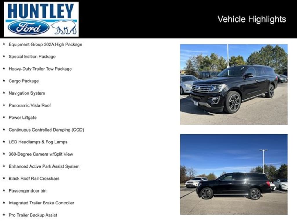 2021 Ford Expedition Max 3.73 Axle Ratio, 360-Degree Camera w/Split View, Black Roof Rail Crossbars, Cargo Package, Continuous Controlled Damping (CCD), Enhanced Active Park Assist System, Equipment Group 302A High Package, Heavy-Duty Trailer Tow Package, Integrated Trailer Brake Controller, LED Headlamps & Fog Lamps, Navigation System, Panoramic Vista Roof, Passenger door bin, Power Liftgate, Pro Trailer Backup Assist, Special Edition Package, Wheels: 22" Premium Black-Painted Aluminum.