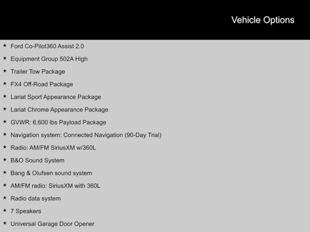 2021 Ford F-150 4WD, 2nd Row Heated Seats, 4x4 FX4 Off-Road Bodyside Decal, 6" Chrome Running Board, 7 Speakers, Accent-Color Angular Step Bars, AM/FM radio: SiriusXM with 360L, B&O Sound System, Bang & Olufsen sound system, Body-Color Front & Rear Bumpers, Box Side Decals, Chrome 2-Bar Grille w/4 Minor Bars, Chrome Door & Tailgate Handles w/Body-Color Bezel, Chrome Single-Tip Exhaust, Chrome Skull Caps on Exterior Mirrors, Class IV Trailer Hitch Receiver, Connected Built-In Navigation, Dark 2-Bar & 1 Minor Bar Style Grille, Electronic Locking w/3.55 Axle Ratio, Equipment Group 502A High, Evasive Steering Assist, Extended Range 36 Gallon Fuel Tank, Ford Co-Pilot360 Assist 2.0, FX4 Off-Road Package, GVWR: 6,600 lbs Payload Package, Heated Steering Wheel, Hill Descent Control, Integrated Trailer Brake Controller, Intelligent Adaptive Cruise Control w/Stop & Go, Intersection Assist, Lariat Chrome Appearance Package, Lariat Sport Appearance Package, Leather-Trimmed Bucket Seats, LED Projector w/Dynamic Bending Headlamps, Monotube Rear Shocks, Navigation system: Connected Navigation (90-Day Trial), Off-Road Tuned Front Shock Absorbers, Onboard 400W Outlet, Power Glass Sideview Mirr w/Chrome Skull Caps, Power Tilt/Telescoping Steering Column w/Memory, Pro Trailer Backup Assist, Radio data system, Radio: AM/FM SiriusXM w/360L, Rain-Sensing Wipers, Rock Crawl Mode, Speed Sign Recognition, SYNC 4 w/Enhanced Voice Recognition, Trailer Tow Package, Tray Style Floor Liner, Universal Garage Door Opener, Wheels: 20" 6-Spoke Dark Alloy Painted Aluminum.