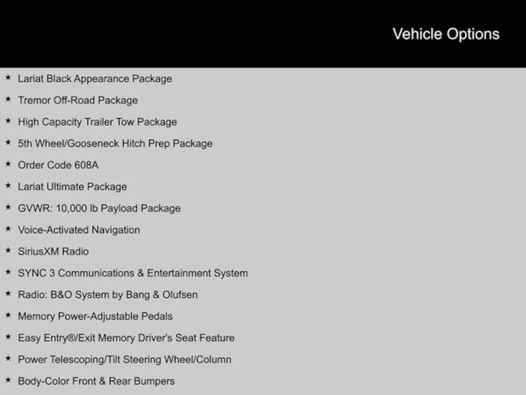 2021 Ford F-250SD 4WD, 110V/400W Outlet, 5th Wheel/Gooseneck Hitch Prep Package, 6" Ebony Black Angular Running Boards, Ambient Lighting - Fixed Color, Black Out Surrounds LED Only Headlamps, Body-Color Front & Rear Bumpers, Body-Color Wheellip Moldings, Easy Entry®/Exit Memory Driver's Seat Feature, Ebony Black Painted Front Grille Bars, Ebony Black Painted Mirror Caps, GVWR: 10,000 lb Payload Package, High Capacity Trailer Tow Package, Intelligent Access w/Push-Button Start, Lane-Keeping Alert, Lariat Black Appearance Package, Lariat Ultimate Package, LED Box Lighting, Memory Power-Adjustable Pedals, Order Code 608A, Power Heated/Ventilated Driver Seat w/Memory, Power Heated/Ventilated Passenger Seat, Power Telescoping/Tilt Steering Wheel/Column, PowerScope Trailer Tow Mirrors w/Memory, Radio: B&O System by Bang & Olufsen, Rear Wheel Well Liners (Pre-Installed), Remote Start System, Remote Tailgate Release, SiriusXM Radio, SYNC 3 Communications & Entertainment System, Tailgate Step & Handle, Textured Matte Finish Off-Road Running Boards, Tough Bed Spray-In Bedliner, Tremor Off-Road Decal, Tremor Off-Road Package, Upfitter Switches (6), Voice-Activated Navigation, Wheels: 20" High-Gloss Black Premium Painted Alum. CARFAX One-Owner.