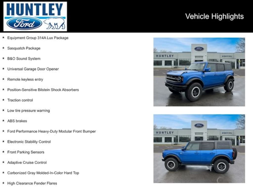 2022 Ford Bronco 12" LCD Capacitive Touchscreen w/Swipe Capability, 2 Smart Charging USB Ports In Dashboard, 360-Degree Camera, 4.7 Final Drive Ratio, ABS brakes, Adaptive Cruise Control, Additional Sound Deadening, B&O Sound System, Carbonized Gray Molded-In-Color Hard Top, Compass, Connected Built-In Navigation, Electronic Stability Control, Equipment Group 314A Lux Package, Evasive Steering Assist, Ford Performance Heavy-Duty Modular Front Bumper, Front Parking Sensors, Front Row Top Panels Storage Bag, Heated door mirrors, Heated Steering Wheel, High Clearance Fender Flares, High Clearance Suspension, Illuminated entry, Information on Demand Panel, Low tire pressure warning, Position-Sensitive Bilstein Shock Absorbers, Rear-Window Defroster & Washer, Remote keyless entry, Sasquatch Package, Sideview Mirrors, Towing Capability, Traction control, Universal Garage Door Opener, Wheels: 17" Black High Gloss-Painted Aluminum, Wireless Charging Pad. CARFAX One-Owner.