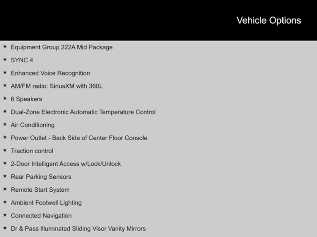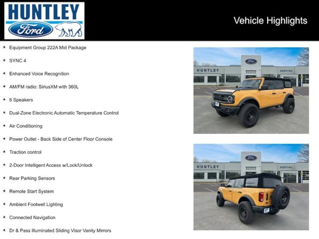2022 Ford Bronco 2-Door Intelligent Access w/Lock/Unlock, 3.73 Axle Ratio, 6 Speakers, Air Conditioning, AM/FM radio: SiriusXM with 360L, Ambient Footwell Lighting, Auto-Dimming Interior Rear-View Mirror, Connected Navigation, Dr & Pass Illuminated Sliding Visor Vanity Mirrors, Dual-Zone Electronic Automatic Temperature Control, Enhanced Voice Recognition, Equipment Group 222A Mid Package, Front Row Heated Seats, Power Outlet - Back Side of Center Floor Console, Rear Parking Sensors, Remote Start System, SYNC 4, Traction control, Wheels: 17" Carbonized Gray-Painted Aluminum.