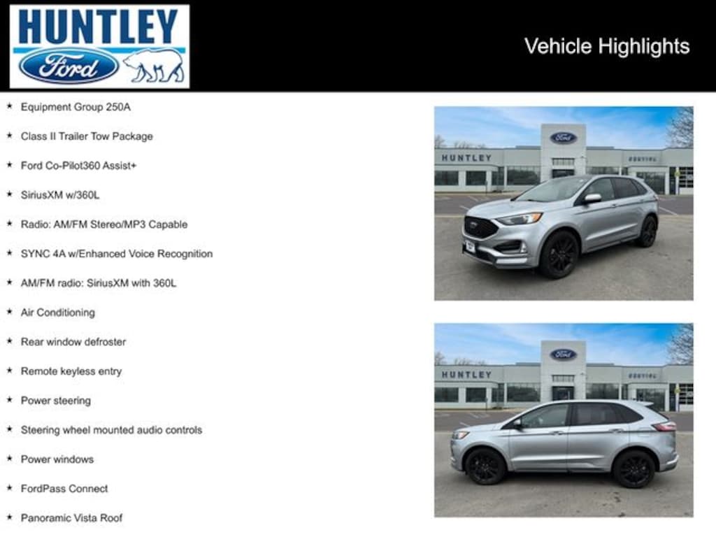 Plus Tax, Title, License and Doc Fee To qualified buyers with approved credit only. 0% APR for 72 months on new Fords. Max 10k financed. $13.89 per thousand financed. Must qualify and finance with captive lender to receive all incentives and rebates. See dealer for details. Although every reasonable effort has been made to ensure the accuracy of the information contained in this site, absolute accuracy cannot be guaranteed. This site and all the information and materials appearing on it, are presented to the user "as is" without a warranty of any kind, either expressed or implied. All vehicles are subject to prior sales. Vehicles shown at different locations are not currently in our inventory but can be made available to you at our location within a reasonable date form the time of your request, not to exceed one week. Huntley Ford serves customers 350 miles or closer. See Dealer for Details.