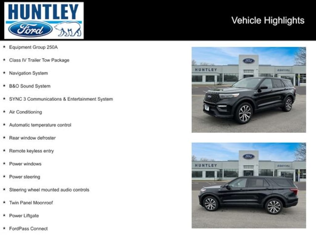 2022 Ford Explorer 4WD, 20" Machined Aluminum w/Painted Pockets Wheels, Air Conditioning, Automatic temperature control, B&O Sound System, Class IV Trailer Tow Package, Equipment Group 250A, FordPass Connect, Navigation System, Power Liftgate, Power steering, Power windows, Rear window defroster, Remote keyless entry, Steering wheel mounted audio controls, SYNC 3 Communications & Entertainment System, Twin Panel Moonroof, Voice-Activated Touchscreen Navigation System. Clean CARFAX. CARFAX One-Owner.