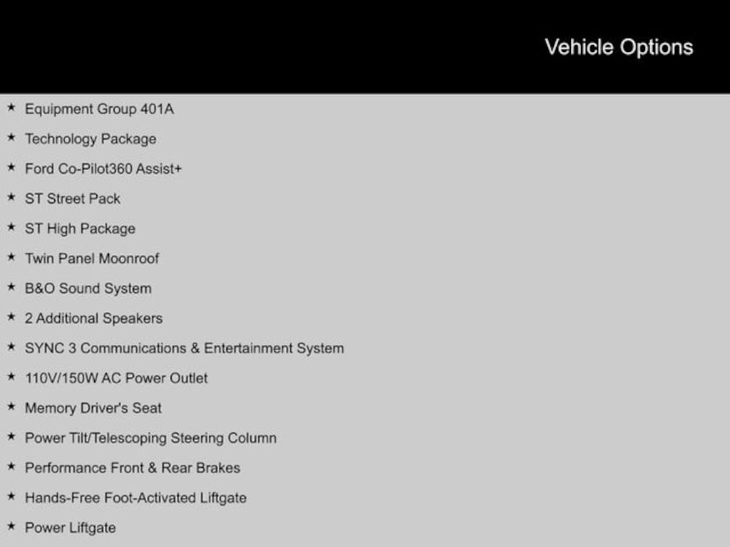 Functional design elements include LED low and high beam headlights, LED front fog lights, and LED daytime running lights, ensuring maximum visibility. The Power Liftgate provides easy access to the cargo area, while the Rear lip spoiler and Stainless steel dual exhaust with chrome tailpipe finishers emphasize the vehicle's ST pedigree. Whether parked in your driveway or cruising through the surrounding area, this SUV makes a powerful statement.