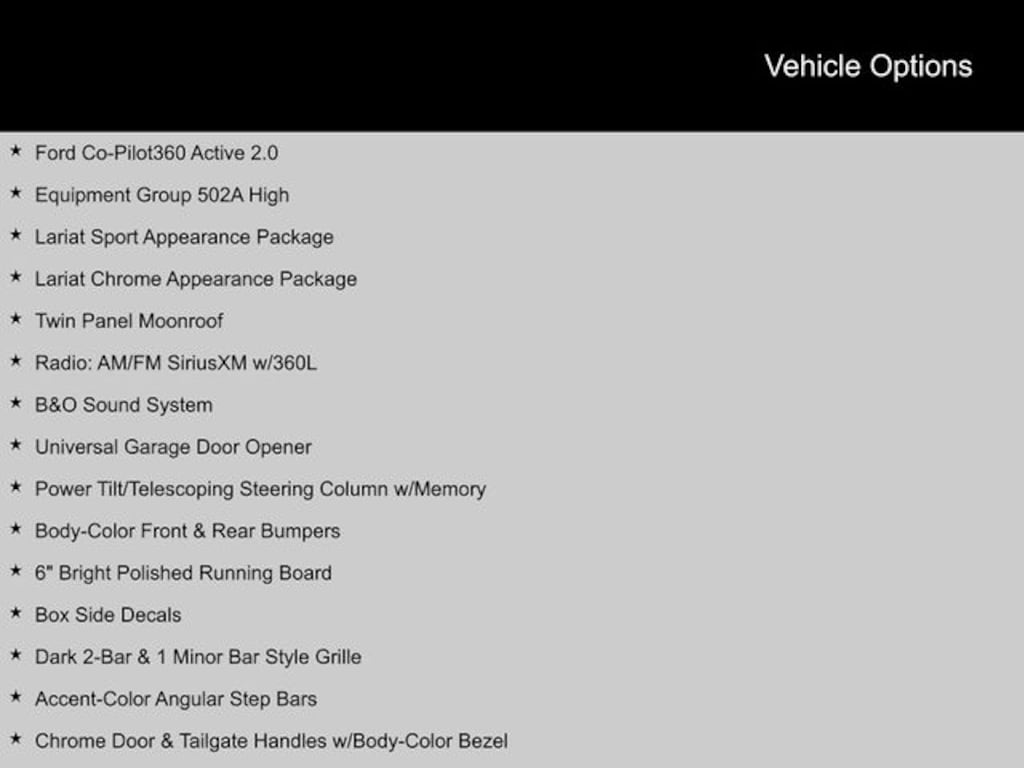 2022 Ford F-150 4WD, 2nd Row Heated Seats, 6" Bright Polished Running Board, Accent-Color Angular Step Bars, Active Park Assist 2.0, B&O Sound System, BlueCruise, Body-Color Front & Rear Bumpers, Box Side Decals, Chrome 2-Bar Grille w/4 Minor Bars, Chrome Door & Tailgate Handles w/Body-Color Bezel, Chrome Single-Tip Exhaust, Chrome Skull Caps on Exterior Mirrors, Dark 2-Bar & 1 Minor Bar Style Grille, Electronic Locking w/3.73 Axle Ratio, Equipment Group 502A High, Ford Co-Pilot360 Active 2.0, Heated Steering Wheel, Lariat Chrome Appearance Package, Lariat Sport Appearance Package, Leather-Trimmed Bucket Seats, LED Projector w/Dynamic Bending Headlamps, Onboard 400W Outlet, Power Glass Sideview Mirr w/Chrome Skull Caps, Power Tilt/Telescoping Steering Column w/Memory, Radio: AM/FM SiriusXM w/360L, Rain-Sensing Wipers, SYNC 4 w/Enhanced Voice Recognition, Twin Panel Moonroof, Universal Garage Door Opener, Wheels: 20" 6-Spoke Dark Alloy Painted Aluminum, Wireless Charging Pad. Clean CARFAX.