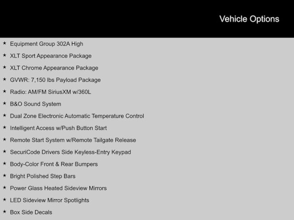 2022 Ford F-150 4WD, 10-Way Power Driver & Passenger Seats, 2-Bar Style Grille w/Chrome 2 Minor Bars, 8" Productivity Screen in Instrument Cluster, Accent-Color Step Bars, Auto-Dimming Rear-View Mirror, B&O Sound System, Black 2-Bar Style Grille w/Black Surround/Accents, Body-Color Door & Tailgate Handles, Body-Color Front & Rear Bumpers, Box Side Decals, Bright Polished Step Bars, Chrome Door & Tailgate Handles w/Body-Color Bezel, Chrome Single-Tip Exhaust, Class IV Trailer Hitch Receiver, Dual Zone Electronic Automatic Temperature Control, Equipment Group 302A High, Extended Range 36 Gallon Fuel Tank, GVWR: 7,150 lbs Payload Package, Heated Front Seats, Intelligent Access w/Push Button Start, Leather-Wrapped Steering Wheel, LED Reflector Headlamps, LED Sideview Mirror Spotlights, Onboard 400W Outlet, Power Glass Heated Sideview Mirrors, Pro Power Onboard - 2KW, Radio: AM/FM SiriusXM w/360L, Rear Under-Seat Storage, Remote Start System w/Remote Tailgate Release, SecuriCode Drivers Side Keyless-Entry Keypad, SYNC 4 w/Enhanced Voice Recognition, Unique Sport Cloth 40/Console/40 Front-Seats, Wheels: 18" 6-Spoke Machined Aluminum, Wheels: 18" Chrome-Like PVD, XLT Chrome Appearance Package, XLT Sport Appearance Package, Zone Lighting. Clean CARFAX.