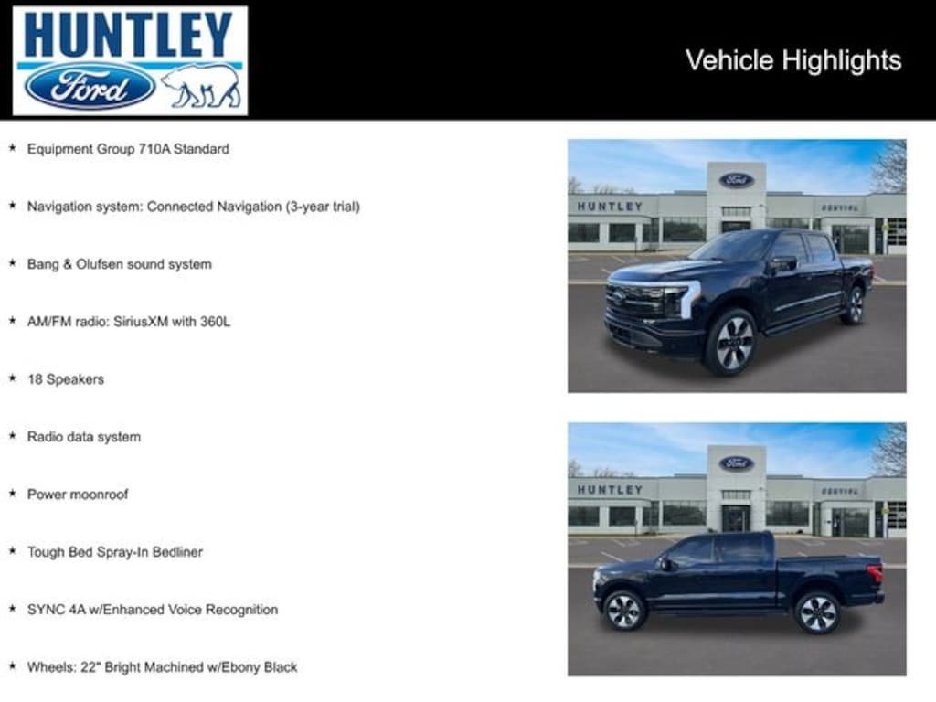 2022 Ford F-150 Lightning 18 Speakers, AM/FM radio: SiriusXM with 360L, Bang & Olufsen sound system, Equipment Group 710A Standard, Navigation system: Connected Navigation (3-year trial), Power moonroof, Radio data system, SYNC 4A w/Enhanced Voice Recognition, Tough Bed Spray-In Bedliner, Wheels: 22" Bright Machined w/Ebony Black. CARFAX One-Owner.