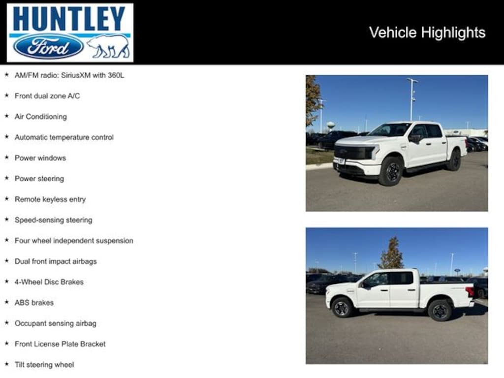 2022 Ford F-150 Lightning 4-Wheel Disc Brakes, ABS brakes, Air Conditioning, AM/FM radio: SiriusXM with 360L, Automatic temperature control, Dual front impact airbags, Four wheel independent suspension, Front dual zone A/C, Front License Plate Bracket, Occupant sensing airbag, Power steering, Power windows, Remote keyless entry, Speed-sensing steering, Telescoping steering wheel, Tilt steering wheel. Clean CARFAX. CARFAX One-Owner.