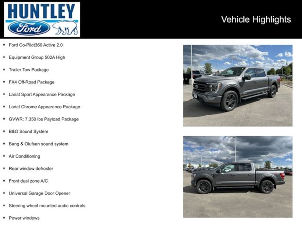 2022 Ford F-150 3.5L PowerBoost Full-Hybrid V6, 4WD, 2nd Row Heated Seats, 4x4 FX4 Off-Road Bodyside Decal, 6" Bright Polished Running Board, Accent-Color Angular Step Bars, Active Park Assist 2.0, Air Conditioning, B&O Sound System, Bang & Olufsen sound system, BlueCruise, Body-Color Front & Rear Bumpers, Box Side Decals, Chrome 2-Bar Grille w/4 Minor Bars, Chrome Door & Tailgate Handles w/Body-Color Bezel, Chrome Single-Tip Exhaust, Chrome Skull Caps on Exterior Mirrors, Class IV Trailer Hitch Receiver, Dark 2-Bar & 1 Minor Bar Style Grille, Electronic Locking w/3.73 Axle Ratio, Equipment Group 502A High, Ford Co-Pilot360 Active 2.0, Front dual zone A/C, FX4 Off-Road Package, GVWR: 7,350 lbs Payload Package, Heated door mirrors, Heated Steering Wheel, Hill Descent Control, Integrated Trailer Brake Controller, Interior Work Surface, Lariat Chrome Appearance Package, Lariat Sport Appearance Package, Leather-Trimmed Bucket Seats, LED Projector w/Dynamic Bending Headlamps, Monotube Rear Shocks, Off-Road Tuned Front Shock Absorbers, Onboard 400W Outlet, Power driver seat, Power Glass Sideview Mirr w/Chrome Skull Caps, Power Tailgate, Power Tilt/Telescoping Steering Column w/Memory, Power windows, Pro Power Onboard - 7.2KW, Pro Trailer Backup Assist, Rain-Sensing Wipers, Rear window defroster, Remote keyless entry, Rock Crawl Mode, Steering wheel mounted audio controls, Tough Bed Spray-In Bedliner, Trailer Tow Package, Tray Style Floor Liner (47W), Twin Panel Moonroof, Universal Garage Door Opener, Wheel Well Liner, Wheels: 20" 6-Spoke Dark Alloy Painted Aluminum, Wireless Charging Pad.