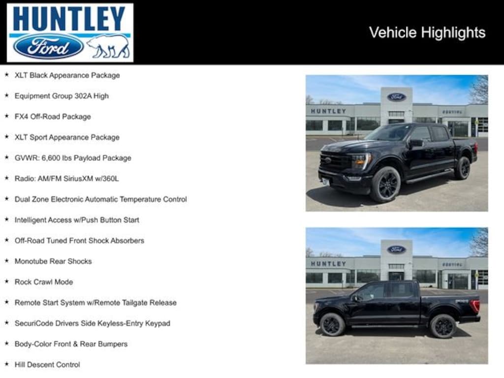 2022 Ford F-150 4WD, 10-Way Power Driver & Passenger Seats, 4x4 FX4 Off-Road Bodyside Decal, 8" Productivity Screen in Instrument Cluster, Accent-Color Step Bars, Auto-Dimming Rear-View Mirror, Black 2-Bar Style Grille w/Black Surround/Accents, Black 6" Angular Step Bars, Black Exterior Badging, Body-Color Door & Tailgate Handles, Body-Color Front & Rear Bumpers, Box Side Decals, Chrome Single-Tip Exhaust, Class IV Trailer Hitch Receiver, Dark Interior Appliques, Dual Zone Electronic Automatic Temperature Control, Equipment Group 302A High, Extended Range 36 Gallon Fuel Tank, FX4 Off-Road Package, GVWR: 6,600 lbs Payload Package, Heated Front Seats, Hill Descent Control, Intelligent Access w/Push Button Start, Leather-Wrapped Steering Wheel, LED Reflector Headlamps, LED Sideview Mirror Spotlights, Matte Black Tailgate F-150 Decal, Monotube Rear Shocks, Off-Road Tuned Front Shock Absorbers, Onboard 400W Outlet, Power Glass Heated Sideview Mirrors, Radio: AM/FM SiriusXM w/360L, Rear Under-Seat Storage, Remote Start System w/Remote Tailgate Release, Rock Crawl Mode, SecuriCode Drivers Side Keyless-Entry Keypad, SYNC 4 w/Enhanced Voice Recognition, Tray Style Floor Liner (47W), Unique Hood & Grille w/Black Accent, Unique Sport Cloth 40/Console/40 Front-Seats, Wheels: 20" Gloss Black Painted Aluminum, XLT Black Appearance Package, XLT Sport Appearance Package, Zone Lighting.