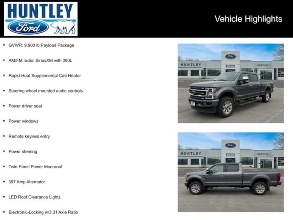 2022 Ford F-250SD 4WD, 397 Amp Alternator, AM/FM radio: SiriusXM with 360L, Electronic-Locking w/3.31 Axle Ratio, GVWR: 9,900 lb Payload Package, LED Roof Clearance Lights, Power driver seat, Power steering, Power windows, Rapid-Heat Supplemental Cab Heater, Remote keyless entry, Steering wheel mounted audio controls, Twin Panel Power Moonroof. Clean CARFAX.