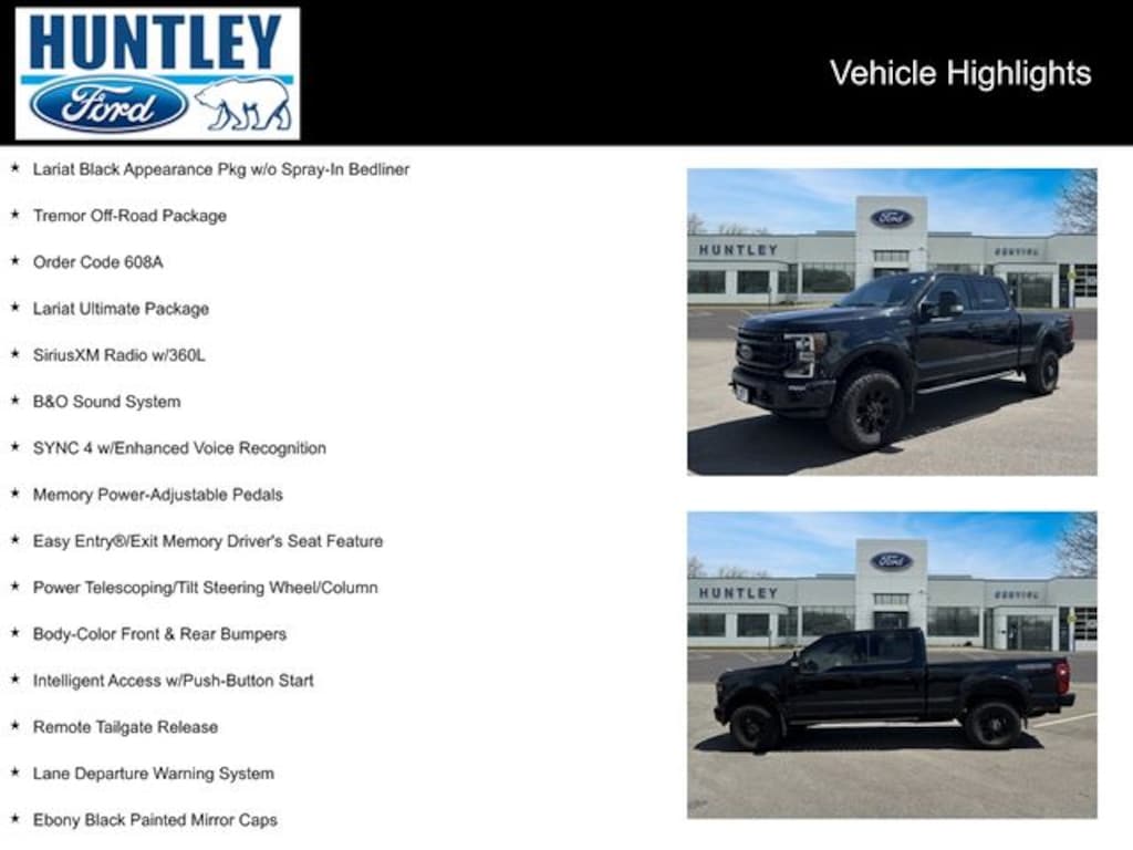2022 Ford F-250SD 4WD, 6" Ebony Black Angular Running Boards, Ambient Lighting - Fixed Color, B&O Sound System, Black Out Surrounds LED Only Headlamps, Body-Color Front & Rear Bumpers, Body-Color Wheellip Moldings, Easy Entry®/Exit Memory Driver's Seat Feature, Ebony Black Painted Front Grille Bars, Ebony Black Painted Mirror Caps, Intelligent Access w/Push-Button Start, Lane Departure Warning System, Lariat Black Appearance Pkg w/o Spray-In Bedliner, Lariat Ultimate Package, LED Box Lighting, Memory Power-Adjustable Pedals, Order Code 608A, Power Heated/Ventilated Driver Seat w/Memory, Power Heated/Ventilated Passenger Seat, Power Telescoping/Tilt Steering Wheel/Column, PowerScope Trailer Tow Mirrors w/Memory, Rear Wheel Well Liners (Pre-Installed), Remote Start System, Remote Tailgate Release, SiriusXM Radio w/360L, SYNC 4 w/Enhanced Voice Recognition, Tailgate Step & Handle, Textured Matte Finish Off-Road Running Boards, Tremor Off-Road Decal, Tremor Off-Road Package, Upfitter Switches (6), Wheels: 18" Low-Gloss Black Painted Aluminum, Wheels: 20" High-Gloss Black Premium Painted Alum. CARFAX One-Owner.