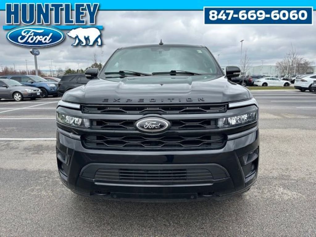 The 2023 Ford Expedition Limited MAX commands attention with its bold and sophisticated exterior. The AGATE BLACK METALLIC paint finish exudes elegance, while the Black Roof Rack Side Rails add a touch of ruggedness. The Bumpers front Body-colored front bumper and Black Rear Bumper create a cohesive and stylish look. The Wheels: 22in Premium Black-Painted Aluminum enhance the vehicle's sporty stance. The First-row sunroof First and second-row sliding and tilting glass sunroof with express open activation sunshade lets you enjoy the open air, and the Spoiler Rear lip spoiler adds a touch of aerodynamic flair. The Active grille shutters optimize fuel efficiency, and the Heavy-Duty Trailer Tow Package prepares you for any towing needs.