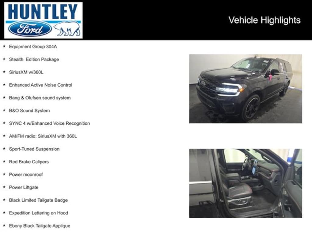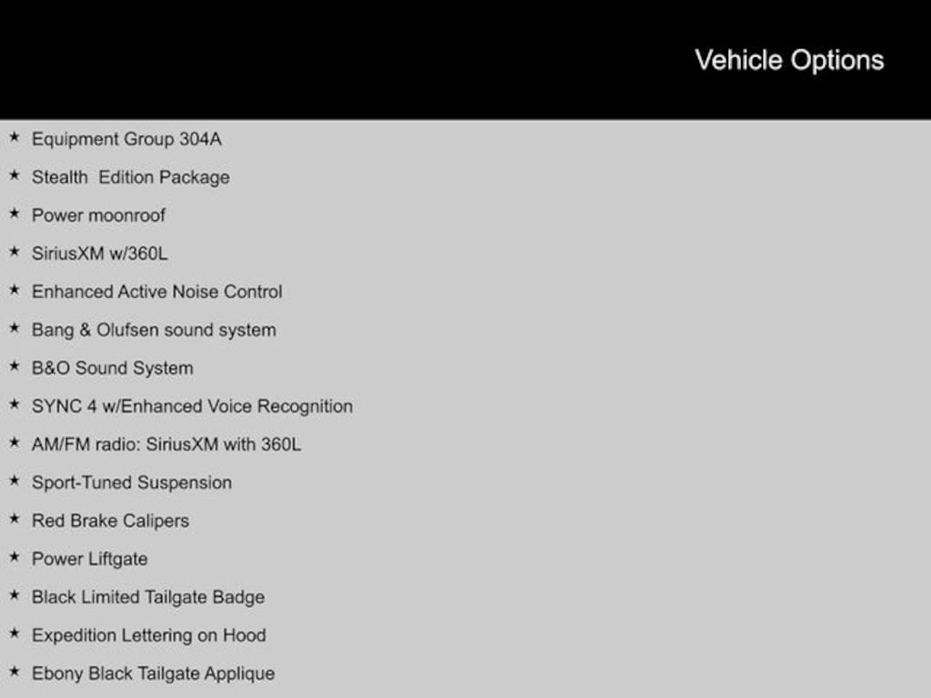 2023 Ford Expedition Max 1st & 2nd Row Floor Mats w/Logo, 3.73 Axle Ratio, AM/FM radio: SiriusXM with 360L, B&O Sound System, Bang & Olufsen sound system, Black Headlamp and Fog Lamp Bezels, Black Limited Tailgate Badge, Black Roof Rack Side Rails, Body Color Door Handles, Dual Exhaust System, Ebony Black Bar and Mesh Grille, Ebony Black Power Deployable Running Boards, Ebony Black Tailgate Applique, Enhanced Active Noise Control, Equipment Group 304A, Expedition Lettering on Hood, Heated/Ventilated Lthr Front Captain's Chairs (A), LED Taillamp w/Black Bezels, Power Liftgate, Power moonroof, Power-Folding Sideview Mirrors w/Autofold, Red Brake Calipers, SiriusXM w/360L, Sport Center Console, Sport-Tuned Suspension, Stealth Edition Package, SYNC 4 w/Enhanced Voice Recognition, Wheels: 22" Premium Black-Painted Aluminum. Clean CARFAX.