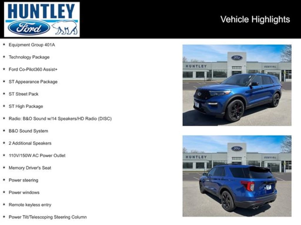 2023 Ford Explorer 4WD, 10.1" LCD Capacitive Portrait Touchscreen, 110V/150W AC Power Outlet, 2 Additional Speakers, 360-Degree Camera w/Split View, Auto-Dimming Rearview Mirror (Interior), B&O Sound System, Equipment Group 401A, Evasive Steering Assist, Ford Co-Pilot360 Assist+, Front & Rear Carpet Floor Mats, Front Parking Sensors, Front Rain-Sensing Wipers, Intelligent Adaptive Cruise Control, Leather Seating Surface Sprt Captain's Chairs, Memory Driver's Seat, Performance Front & Rear Brakes, Power steering, Power Tilt/Telescoping Steering Column, Power windows, Radio: B&O Sound w/14 Speakers/HD Radio (DISC), Remote keyless entry, Reverse Brake Assist, Second Row Heated Seats, Sideview Mirrors w/Gloss Black Caps, Speed Sign Recognition, ST Appearance Package, ST High Package, ST Street Pack, Technology Package, Third Row PowerFold (Folds Flat), Universal Garage Door Opener (UGDO), Voice-Activated Touchscreen Navigation System, Wheels: 21" Aluminum, Wireless Charging Pad. Clean CARFAX.