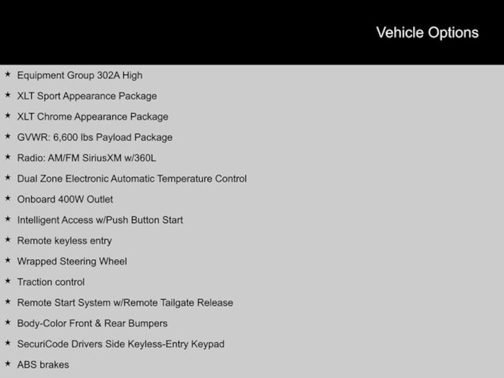 2023 Ford F-150 4WD, 10-Way Power Driver & Passenger Seats, 2-Bar Style Grille w/Chrome 2 Minor Bars, 3.55 Axle Ratio, 8" Productivity Screen in Instrument Cluster, ABS brakes, Accent-Color Step Bars, Alloy wheels, Auto-Dimming Rear-View Mirror, Black 2-Bar Style Grille w/Black Surround/Accents, Body-Color Door & Tailgate Handles, Body-Color Front & Rear Bumpers, Box Side Decals, Bright Polished Step Bars, Chrome Door & Tailgate Handles w/Body-Color Bezel, Chrome Single-Tip Exhaust, Class IV Trailer Hitch Receiver, Compass, Dual Zone Electronic Automatic Temperature Control, Electronic Stability Control, Equipment Group 302A High, Extended Range 36 Gallon Fuel Tank, GVWR: 6,600 lbs Payload Package, Heated door mirrors, Heated Front Seats, Illuminated entry, Intelligent Access w/Push Button Start, LED Reflector Headlamps, LED Sideview Mirror Spotlights, Low tire pressure warning, Onboard 400W Outlet, Power Glass Heated Sideview Mirrors, Radio: AM/FM SiriusXM w/360L, Rear Under-Seat Storage, Remote keyless entry, Remote Start System w/Remote Tailgate Release, SecuriCode Drivers Side Keyless-Entry Keypad, SYNC 4 w/Enhanced Voice Recognition, Tough Bed Spray-In Bedliner, Traction control, Unique Sport Cloth 40/Console/40 Front-Seats, Wheels: 18" 6-Spoke Machined Aluminum, Wheels: 18" Chrome-Like PVD, Wrapped Steering Wheel, XLT Chrome Appearance Package, XLT Sport Appearance Package, Zone Lighting. Clean CARFAX.