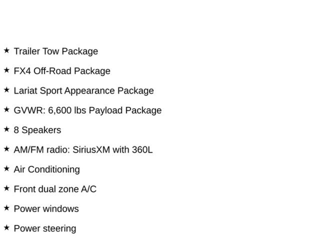 2023 Ford F-150 10-Speed Automatic 4WD, 4x4 FX4 Off-Road Bodyside Decal, 8 Speakers, ABS brakes, Accent-Color Angular Step Bars, Air Conditioning, Alloy wheels, AM/FM radio: SiriusXM with 360L, Body-Color Front & Rear Bumpers, Box Side Decals, Chrome Single-Tip Exhaust, Class IV Trailer Hitch Receiver, Compass, Dark 2-Bar & 1 Minor Bar Style Grille, Electronic Stability Control, Front dual zone A/C, FX4 Off-Road Package, GVWR: 6,600 lbs Payload Package, Heated door mirrors, Heated front seats, Hill Descent Control, Illuminated entry, Integrated Trailer Brake Controller, Lariat Sport Appearance Package, Low tire pressure warning, Monotube Rear Shocks, Off-Road Tuned Front Shock Absorbers, Power driver seat, Power steering, Power windows, Pro Trailer Backup Assist & Pro Trailer Hitch Assist, Remote keyless entry, Rock Crawl Mode, Tachometer, Telescoping steering wheel, Tilt steering wheel, Traction control, Trailer Tow Package, Trip computer. Clean CARFAX. 2.7L V6 EcoBoost
