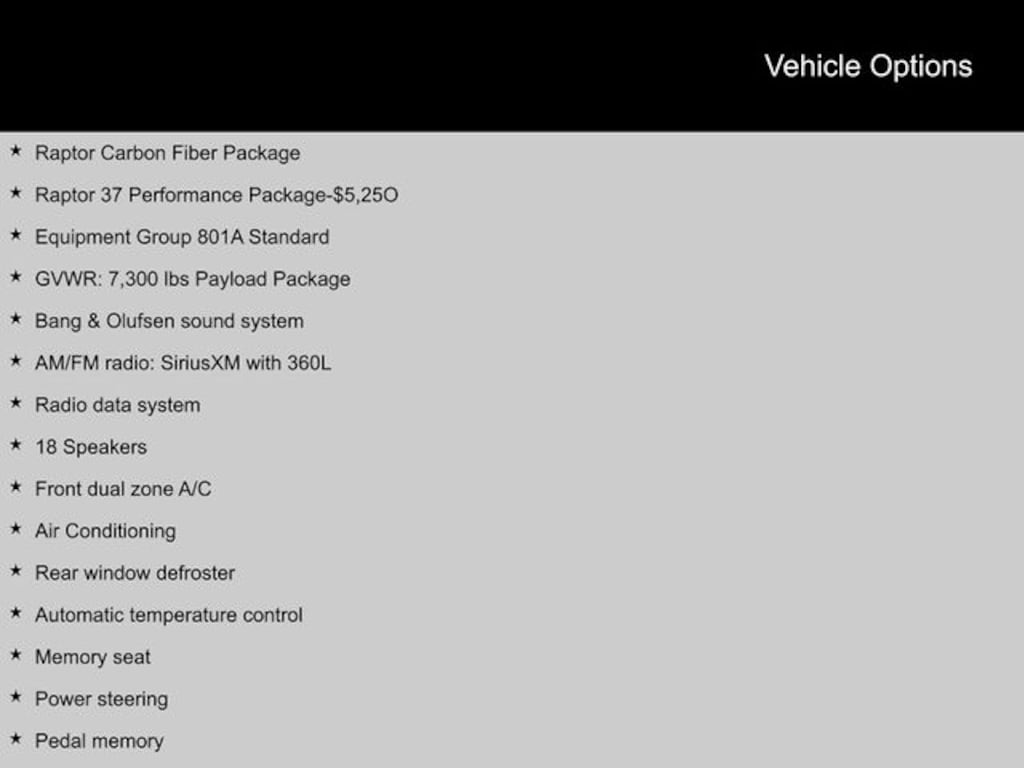2023 Ford F-150 4WD, 18 Speakers, Air Conditioning, AM/FM radio: SiriusXM with 360L, Automatic temperature control, Bang & Olufsen sound system, Electronic Locking w/4.10 Axle Ratio, Equipment Group 801A Standard, Front dual zone A/C, GVWR: 7,300 lbs Payload Package, Memory seat, Pedal memory, Power driver seat, Power steering, Power windows, Radio data system, Raptor 37 Graphics, Raptor 37 Performance Package-$5,25O, Raptor Carbon Fiber Package, Rear window defroster, Sport Tuned Shock Absorbers, SYNC 4 w/Enhanced Voice Recognition, Wheels: Unique 17" Forged Aluminum Bead-Lock Capable. CARFAX One-Owner.