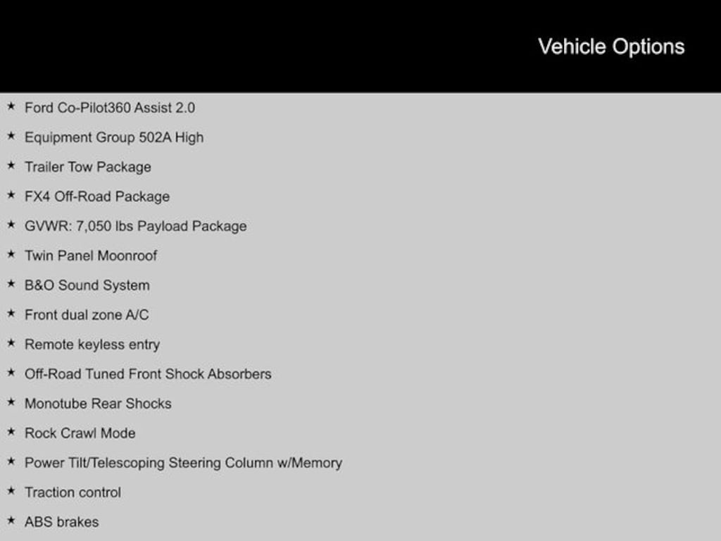 2023 Ford F-150 4WD, 2nd Row Heated Seats, 4x4 FX4 Off-Road Bodyside Decal, ABS brakes, Alloy wheels, B&O Sound System, Class IV Trailer Hitch Receiver, Compass, Connected Built-In Navigation, Electronic Locking w/3.31 Axle Ratio, Electronic Stability Control, Equipment Group 502A High, Evasive Steering Assist, Extended Range 36 Gallon Fuel Tank, Ford Co-Pilot360 Assist 2.0, Front dual zone A/C, FX4 Off-Road Package, GVWR: 7,050 lbs Payload Package, Heated door mirrors, Heated front seats, Hill Descent Control, Illuminated entry, Integrated Trailer Brake Controller, Intelligent Adaptive Cruise Control w/Stop & Go, Interior Work Surface, Intersection Assist, LED Projector w/Dynamic Bending Headlamps, Low tire pressure warning, Monotube Rear Shocks, Off-Road Tuned Front Shock Absorbers, Power Tilt/Telescoping Steering Column w/Memory, Pro Trailer Backup Assist & Pro Trailer Hitch Assist, Rain-Sensing Wipers, Remote keyless entry, Rock Crawl Mode, Speed Sign Recognition, SYNC 4 w/Enhanced Voice Recognition, Traction control, Trailer Tow Package, Twin Panel Moonroof, Wheels: 20" 6-Spoke Dark Alloy Painted Aluminum, Wireless Charging Pad. Clean CARFAX.