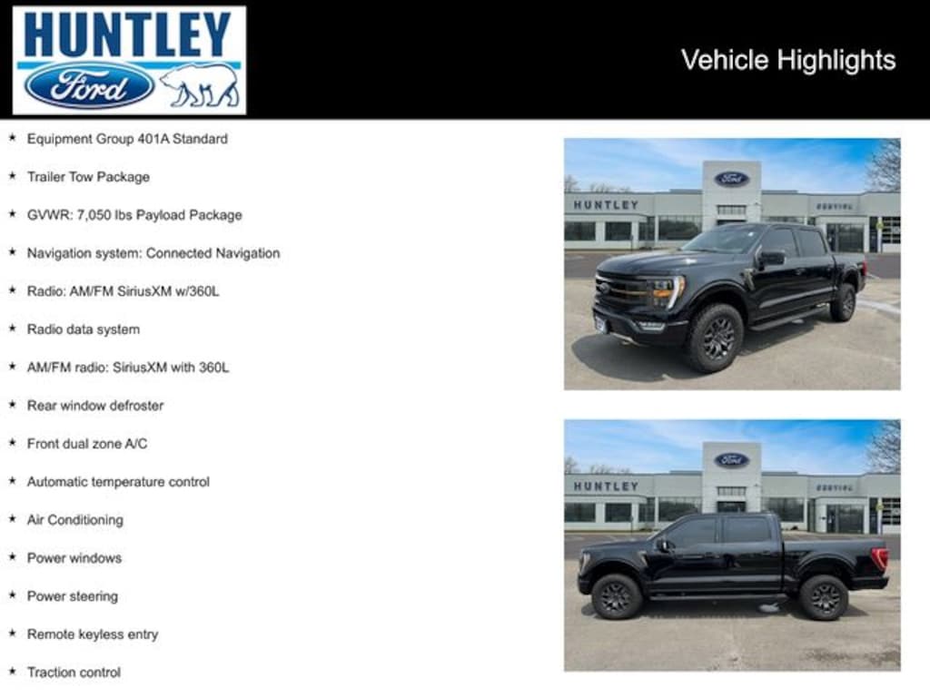 2023 Ford F-150 4WD, ABS brakes, Air Conditioning, Alloy wheels, AM/FM radio: SiriusXM with 360L, Automatic temperature control, Class IV Trailer Hitch Receiver, Compass, Electronic Locking w/3.73 Axle Ratio, Electronic Stability Control, Equipment Group 401A Standard, Front dual zone A/C, GVWR: 7,050 lbs Payload Package, Heated door mirrors, Heated front seats, Illuminated entry, Integrated Trailer Brake Controller, Interior Work Surface, Low tire pressure warning, Navigation system: Connected Navigation, Power steering, Power windows, Pro Trailer Backup Assist & Pro Trailer Hitch Assist, Radio data system, Radio: AM/FM SiriusXM w/360L, Rear window defroster, Remote keyless entry, SYNC 4 w/Enhanced Voice Recognition, Traction control, Trailer Tow Package, Wheels: 18" Alloy w/Dark Matte Finish. Clean CARFAX. CARFAX One-Owner.