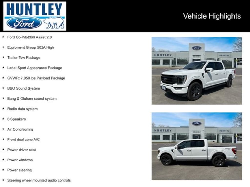 2023 Ford F-150 4WD, 2nd Row Heated Seats, 3.31 Axle Ratio, 8 Speakers, ABS brakes, Accent-Color Angular Step Bars, Air Conditioning, Alloy wheels, B&O Sound System, Bang & Olufsen sound system, Body-Color Front & Rear Bumpers, Box Side Decals, Chrome Single-Tip Exhaust, Class IV Trailer Hitch Receiver, Compass, Connected Built-In Navigation, Dark 2-Bar & 1 Minor Bar Style Grille, Electronic Stability Control, Equipment Group 502A High, Evasive Steering Assist, Ford Co-Pilot360 Assist 2.0, Front dual zone A/C, GVWR: 7,050 lbs Payload Package, Heated door mirrors, Heated front seats, Illuminated entry, Integrated Trailer Brake Controller, Intelligent Adaptive Cruise Control w/Stop & Go, Intersection Assist, Lariat Sport Appearance Package, LED Projector w/Dynamic Bending Headlamps, Low tire pressure warning, Power driver seat, Power steering, Power Tilt/Telescoping Steering Column w/Memory, Power windows, Pro Trailer Backup Assist & Pro Trailer Hitch Assist, Radio data system, Rain-Sensing Wipers, Remote keyless entry, Speed Sign Recognition, Steering wheel mounted audio controls, SYNC 4 w/Enhanced Voice Recognition, Traction control, Trailer Tow Package, Twin Panel Moonroof, Wheels: 20" Chrome-Like PVD, Wireless Charging Pad. Clean CARFAX.