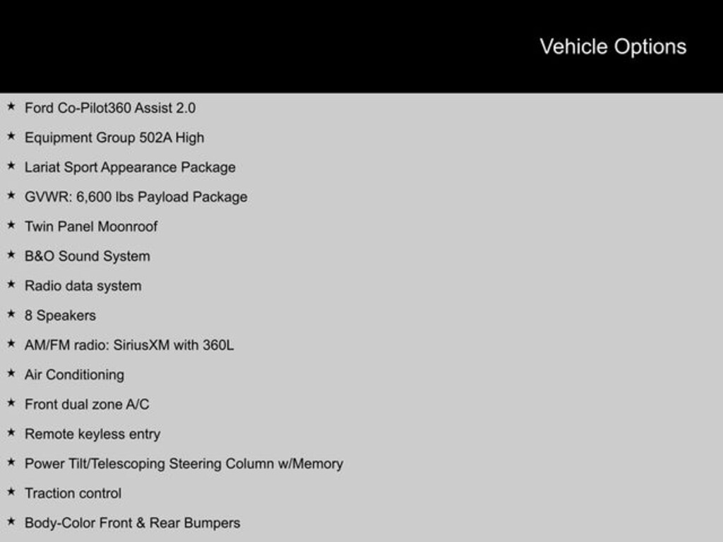 2023 Ford F-150 4WD, 2nd Row Heated Seats, 3.55 Axle Ratio, 360 Degree Camera, 8 Speakers, ABS brakes, Accent-Color Angular Step Bars, Air Conditioning, Alloy wheels, AM/FM radio: SiriusXM with 360L, B&O Sound System, Bed Tray, Body-Color Front & Rear Bumpers, Box Side Decals, Chrome Single-Tip Exhaust, Class IV Trailer Hitch Receiver, Compass, Connected Built-In Navigation, Dark 2-Bar & 1 Minor Bar Style Grille, Electronic Stability Control, Equipment Group 502A High, Evasive Steering Assist, Extended Range 36 Gallon Fuel Tank, Ford Co-Pilot360 Assist 2.0, Front dual zone A/C, GVWR: 6,600 lbs Payload Package, Heated door mirrors, Heated front seats, Illuminated entry, Intelligent Adaptive Cruise Control w/Stop & Go, Intersection Assist, Lariat Sport Appearance Package, LED Projector w/Dynamic Bending Headlamps, Low tire pressure warning, Power Tilt/Telescoping Steering Column w/Memory, Radio data system, Rain-Sensing Wipers, Remote keyless entry, Speed Sign Recognition, SYNC 4 w/Enhanced Voice Recognition, Traction control, Twin Panel Moonroof, Wheels: 20" 6-Spoke Dark Alloy Painted Aluminum, Wireless Charging Pad.