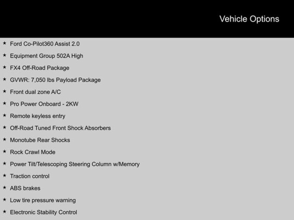 2023 Ford F-150 4WD, 2nd Row Heated Seats, 4x4 FX4 Off-Road Bodyside Decal, ABS brakes, Alloy wheels, Compass, Connected Built-In Navigation, Electronic Locking w/3.55 Axle Ratio, Electronic Stability Control, Equipment Group 502A High, Evasive Steering Assist, Ford Co-Pilot360 Assist 2.0, Front dual zone A/C, FX4 Off-Road Package, GVWR: 7,050 lbs Payload Package, Heated door mirrors, Heated front seats, Hill Descent Control, Illuminated entry, Intelligent Adaptive Cruise Control w/Stop & Go, Intersection Assist, LED Projector w/Dynamic Bending Headlamps, LED Sideview Mirror Spotlights, Low tire pressure warning, Monotube Rear Shocks, Off-Road Tuned Front Shock Absorbers, Onboard Scale w/Smart Hitch, Power Telescoping/Glass/Folding Trailer Tow Mirrors, Power Tilt/Telescoping Steering Column w/Memory, Power-Deployable Running Boards, Pro Power Onboard - 2KW, Rain-Sensing Wipers, Remote keyless entry, Rock Crawl Mode, Speed Sign Recognition, Traction control, Wheels: 20" 6-Spoke Dark Alloy Painted Aluminum, Wireless Charging Pad.