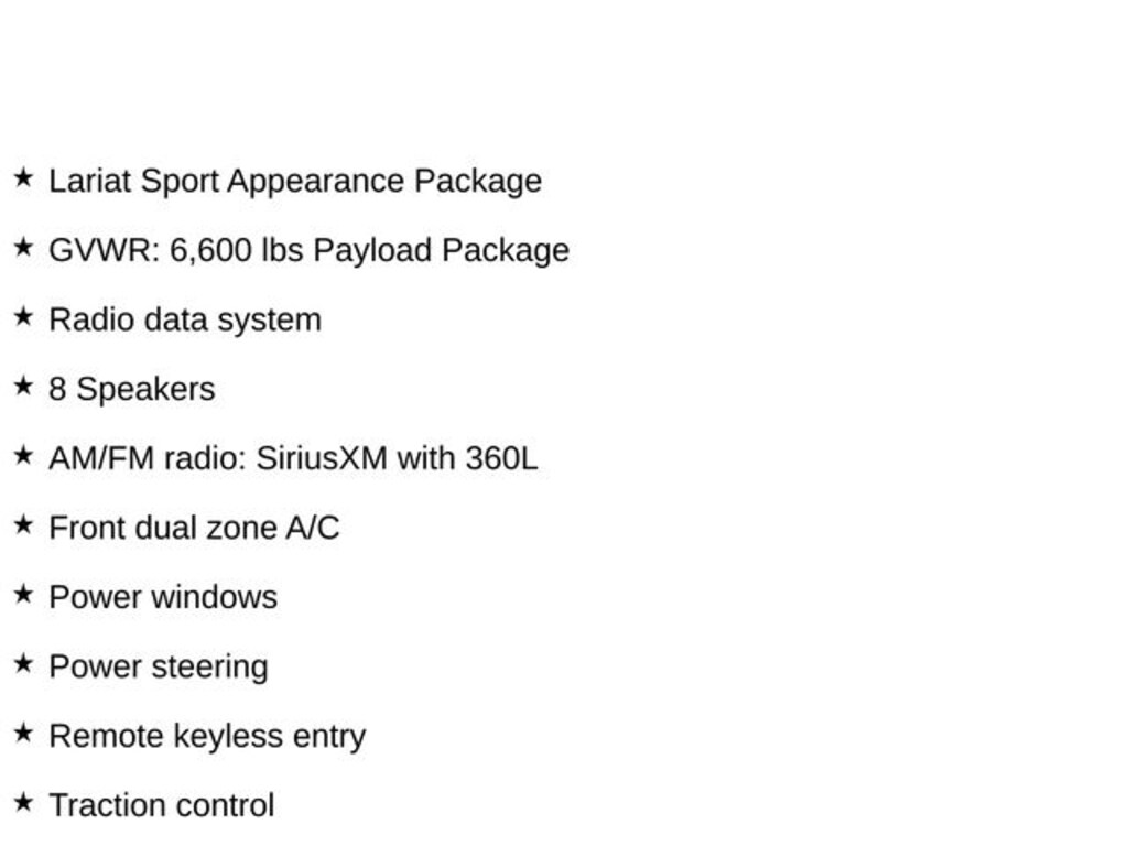 2023 Ford F-150 10-Speed Automatic 4WD, 8 Speakers, ABS brakes, Accent-Color Angular Step Bars, Alloy wheels, AM/FM radio: SiriusXM with 360L, Body-Color Front & Rear Bumpers, Box Side Decals, Chrome Single-Tip Exhaust, Compass, Dark 2-Bar & 1 Minor Bar Style Grille, Electronic Stability Control, Front dual zone A/C, GVWR: 6,600 lbs Payload Package, Heated door mirrors, Heated front seats, Illuminated entry, Lariat Sport Appearance Package, Low tire pressure warning, Power steering, Power windows, Radio data system, Remote keyless entry, Tachometer, Telescoping steering wheel, Tilt steering wheel, Traction control, Wheels: 18" 6-Spoke Machined Aluminum. 2.7L V6 EcoBoost