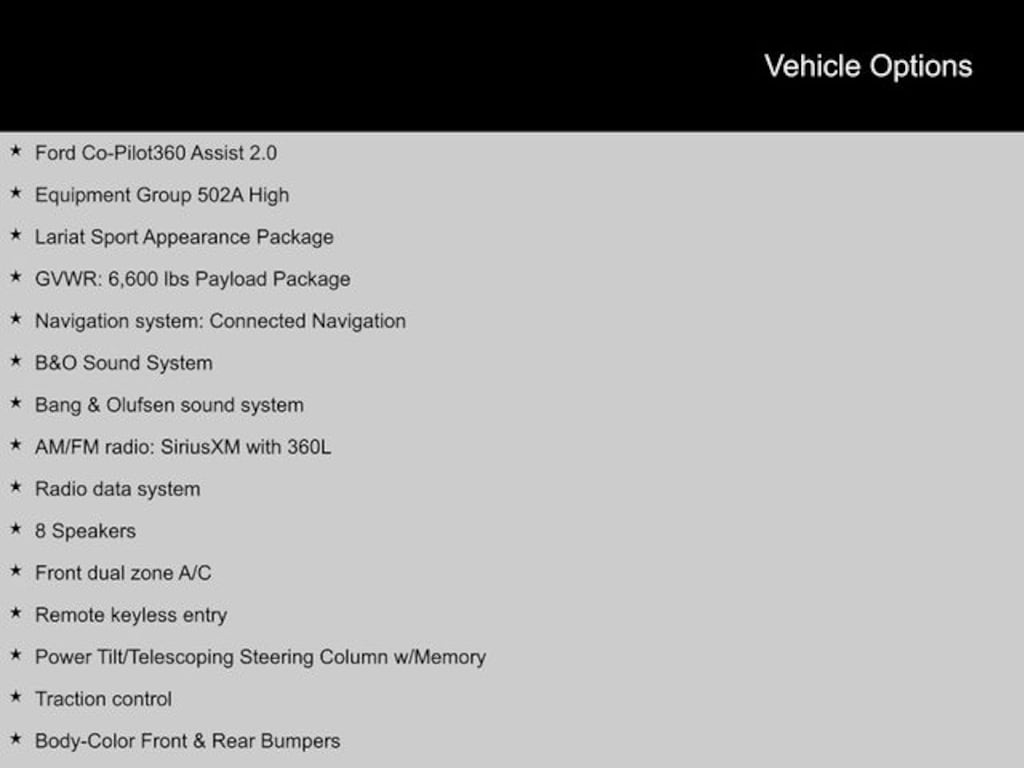 2023 Ford F-150 4WD, 2nd Row Heated Seats, 360 Degree Camera, 8 Speakers, ABS brakes, Accent-Color Angular Step Bars, AM/FM radio: SiriusXM with 360L, B&O Sound System, Bang & Olufsen sound system, Body-Color Front & Rear Bumpers, Box Side Decals, Chrome Single-Tip Exhaust, Compass, Connected Built-In Navigation, Dark 2-Bar & 1 Minor Bar Style Grille, Electronic Locking w/3.55 Axle Ratio, Electronic Stability Control, Equipment Group 502A High, Evasive Steering Assist, Extended Range 36 Gallon Fuel Tank, Ford Co-Pilot360 Assist 2.0, Front dual zone A/C, GVWR: 6,600 lbs Payload Package, Heated door mirrors, Heated front seats, Illuminated entry, Intelligent Adaptive Cruise Control w/Stop & Go, Intersection Assist, Lariat Sport Appearance Package, LED Projector w/Dynamic Bending Headlamps, Low tire pressure warning, Navigation system: Connected Navigation, Power Tilt/Telescoping Steering Column w/Memory, Radio data system, Rain-Sensing Wipers, Remote keyless entry, Speed Sign Recognition, SYNC 4 w/Enhanced Voice Recognition, Traction control, Wheels: 20" 6-Spoke Dark Alloy Painted Aluminum, Wireless Charging Pad. Clean CARFAX.